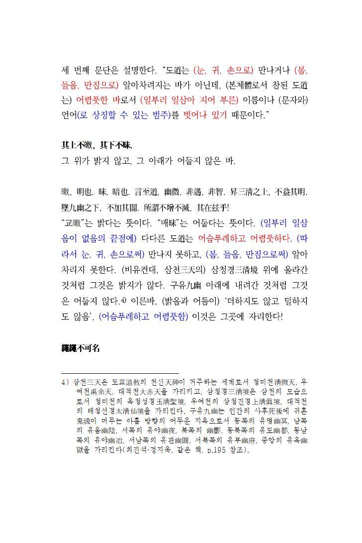네 번째 문단은 설명한다. “(도道는) 본체體로서 (일부러 일삼은) 색깔과 소리와 다르다. (일부러 일삼은) 모습이 없이 만물과 어우러지고 아우러지는 바이기 때문이다.”