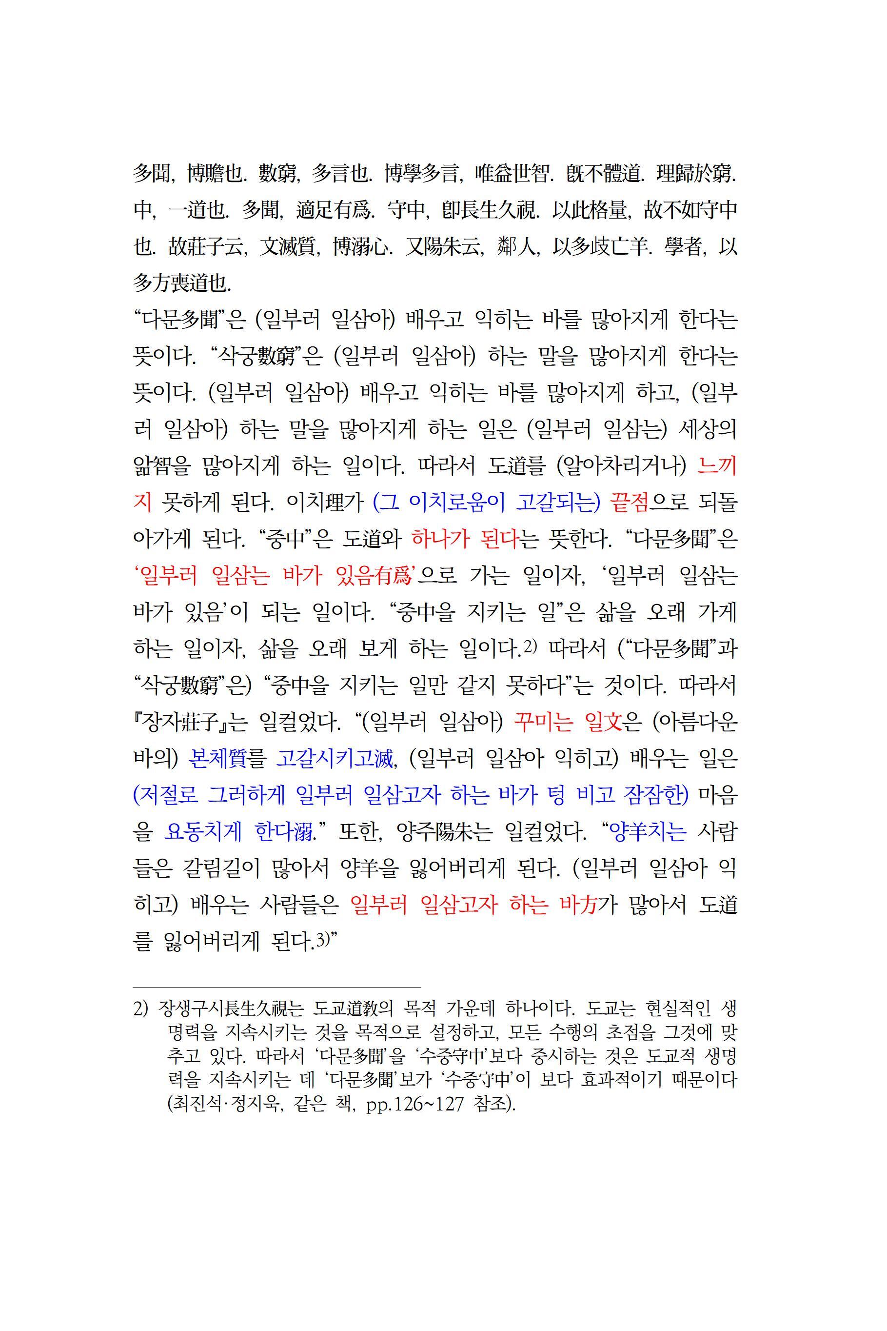 “다문多聞”은 (일부러 일삼아) 배우고 익히는 바를 많아지게 한다는 뜻이다. “삭궁數窮”은 (일부러 일삼아) 하는 말을 많아지게 한다는 뜻이다. (일부러 일삼아) 배우고 익히는 바를 많아지게 하고, (일부러 일삼아) 하는 말을 많아지게 하는 일은 (일부러 일삼는) 세상의 앎智을 많아지게 하는 일이다. 따라서 도道를 (알아차리거나) 느끼지 못하게 된다. 이치理가 (그 이치로움이 고갈되는) 끝점으로 되돌아가게 된다. “중中”은 도道와 하나가 된다는 뜻한다. “다문多聞”은 ‘일부러 일삼는 바가 있음有爲’으로 가는 일이자, ‘일부러 일삼는 바가 있음’이 되는 일이다. “중中을 지키는 일”은 삶을 오래 가게 하는 일이자, 삶을 오래 보게 하는 일이다. 따라서 (“다문多聞”과 “삭궁數窮”은) “중中을 지키는 일만 같지 못하다”는 것이다. 따라서 『장자莊子』는 일컬었다. “(일부러 일삼아) 꾸미는 일文은 (아름다운 바의) 본체質를 고갈시키고滅, (일부러 일삼아 익히고) 배우는 일은 (저절로 그러하게 일부러 일삼고자 하는 바가 텅 비고 잠잠한) 마음을 요동치게 한다溺.” 또한, 양주陽朱는 일컬었다. “양羊치는 사람들은 갈림길이 많아서 양羊을 잃어버리게 된다. (일부러 일삼아 익히고) 배우는 사람들은 일부러 일삼고자 하는 바方가 많아서 도道를 잃어버리게 된다.”