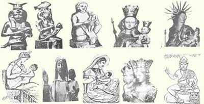 1. 바벨론에서는 여신을 세미라미스(Semiramis)라 하였고 남신을 담무즈(Tammuz)라 하였던 것이다. 2. 중국에서는 어머니 신 곧 여신을 성모(聖母)를 싱무라 하였다. 3. 독일 지방에서는 아기를 안고 있는 처녀 신을 헤르타(Hertha)라 하였다. 4. 스칸디나비아 지방에서는 아기를 안고 있는 여신을 디사(Disa)라 하였다. 5. 에투리아 지방에서는 아기를 안고 있는 여신을 누트리아(Nutria)라고 했다. 6. 드루이드 교에서는 여신을 비르가 파티튜라(Virga-Patitura)라고 했다. 7. 인도 지방에서는 어머니 신을 인드라니(Indrani)라고 했다. 8. 인도의 다른 지방에서는 여신을 데바키(Devaki), 아들을 크리쉬나(Chrishina)라고 불렀다. 9. 슈메르인들은 여신을 나나(Nana)라고 불렀다. 9. 로마에서는 여신을 비너스(Venus)라 하였고 아들 신을 쥬피터(Jupeter)라 한다. 10. 소아시아 지방에서는 여신을 키벨레(Cybele)라 하고 아들은 데이오스(Deoius)라고 했다. 11. 가나안 지방에서는 여신 아스다롯(Ashtharot)을 섬겼다. 12. 에베소 지방에서는 여신을 아데미(Ardemis)라고 하였다. 혹은 다이아나(Diana)라고 했다. 13. 고린도 지방에서는 여신을 아프로디테(Aphrodite)라고 하였다. 14. 애굽에서는 여신을 아이시스(Isis)라 하였고 그 여신의 아들은 호루스(Horus)라고 불렀다.