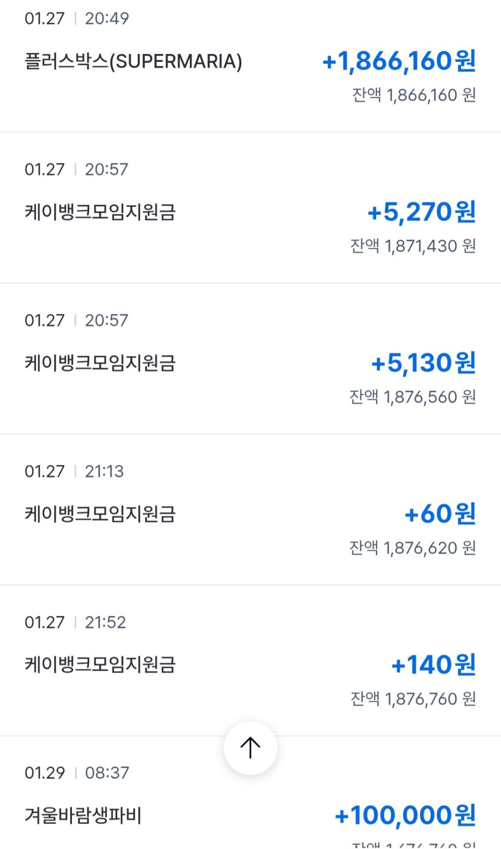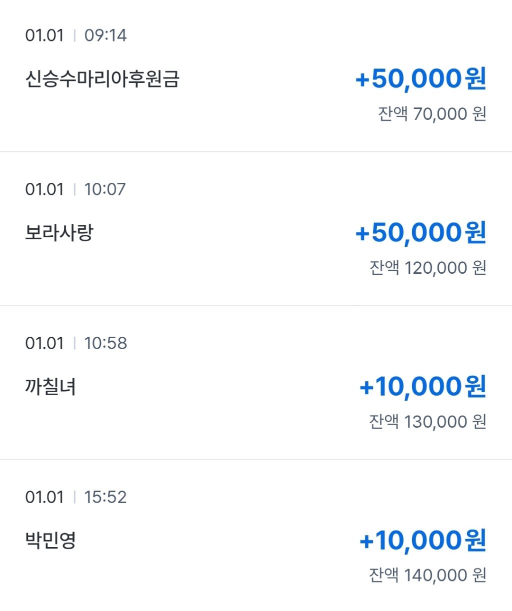 1/1~2/4 후원금 내역입니다. 작성자몽혼M광명|작성시간26.02.04|조회수200 목록 댓글 7 글자크기 작게가 글자크기 크게가 1월 27일부로 기존 개인 계좌를 슈퍼마리아 전용계좌로 전환하여,플러스박스로 분리해두던 후원금을 이관하였습니다.출금 증빙 가능한 영수증 내역입니다.만원의 행복에 참여해주신 회원 여러분 감사드립니다~! 다음검색 현재 게시글 추가 기능 열기 북마크 공유하기 신고 센터로 신고 댓글 댓글 7 댓글쓰기 답글쓰기 댓글 리스트 작성자겨울바람M서울 | 작성시간 26.02.05 수고하셨어요! 작성자둘리몽실이M하남미사리 | 작성시간 26.02.05 수고했어요 케이뱅크 계좌번호 어디있나요 답댓글 작성자보라사랑M세종 | 작성시간 26.02.05 안녕하십니까?케이뱅크 계좌번호입니다SUPER MARIA777 013 080357 답댓글 작성자둘리몽실이M하남미사리 | 작성시간 26.02.05 보라사랑M세종 감사합니다^^ 보라사랑님 작성자모닝M강원 | 작성시간 26.02.05 수고하셨습니다 행복한날되세요 댓글 전체보기