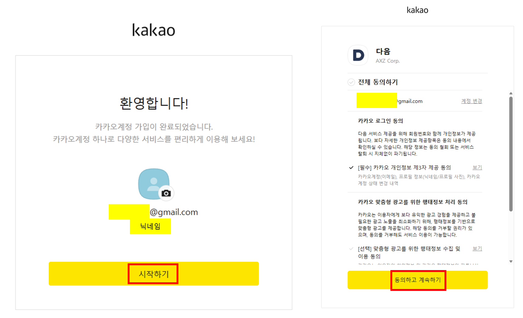 8. 계정이 생성 된 것을 확인 후 시작하기를 클릭 후 약관 선택하여 동의하고 계속하기를 클릭. 8. Verify that your account has been created, click Start, select the terms and conditions, accept it, and click Continue. 8. アカウントが作成されたことを確認してから始めるをクリックし、約款を選択して同意してから続けるをクリック。