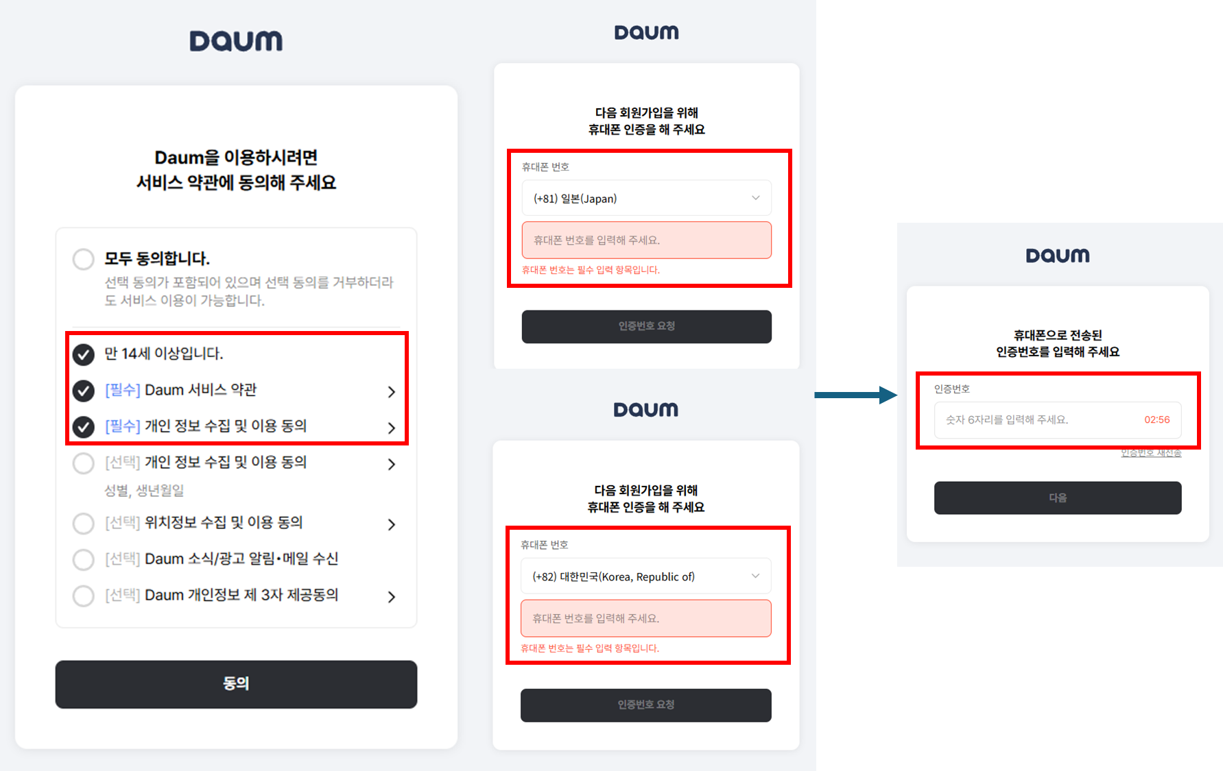 9. 약관 선택 및 동의 후 휴대폰 인증(다음 회원가입)을 진행하여 인증까지 한다. 9. After selecting and agreeing to the terms and conditions, mobile phone authentication (next member registration) is performed to certify. 9. 約款の選択及び同意後、携帯電話認証(次の会員登録)を行い、認証まで行う。