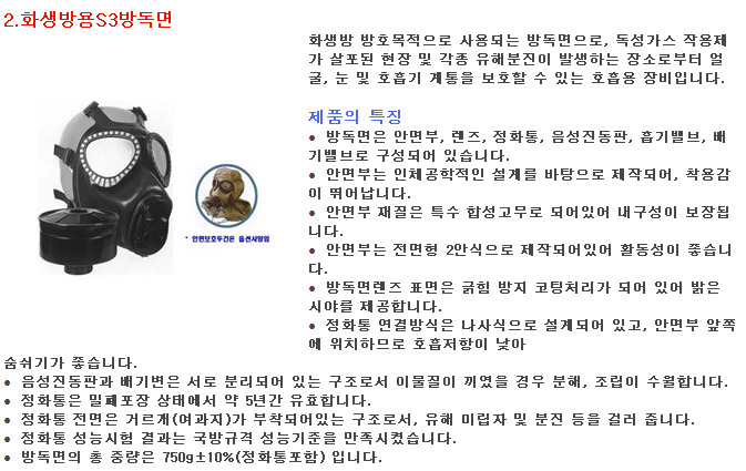 일단 군용 K-1방독면을 생산하는 회사이기에 어느정도 노하우가 있다고보시면됩니다. 불량이 난것은 일산화탄소정화문제로 독가스정화는 문제된것이없죠