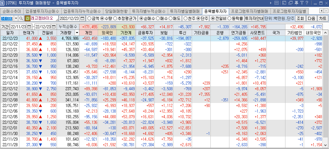 수급정보를 보면 기관들이 주가는 떨어지는데 매집한 내용이 있기 때문이다.