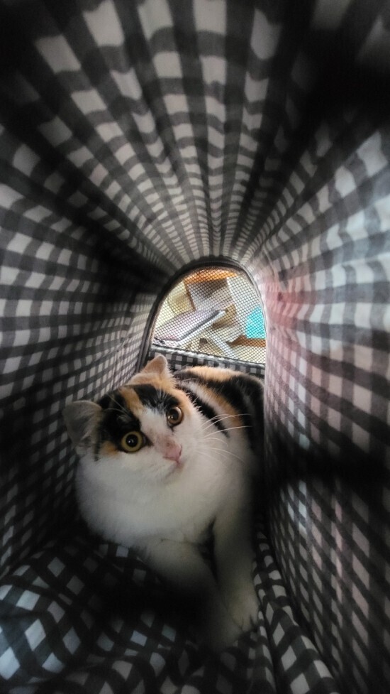 사람이 문을 열고 다가가려고 하면 벌집 캣타워에서 요리 조리 몸을 숨기고 동태를 관찰하던 빵덕이는 이제 서서히 재미있는 것과 사람에게 마음을 열기 시작했습니다.