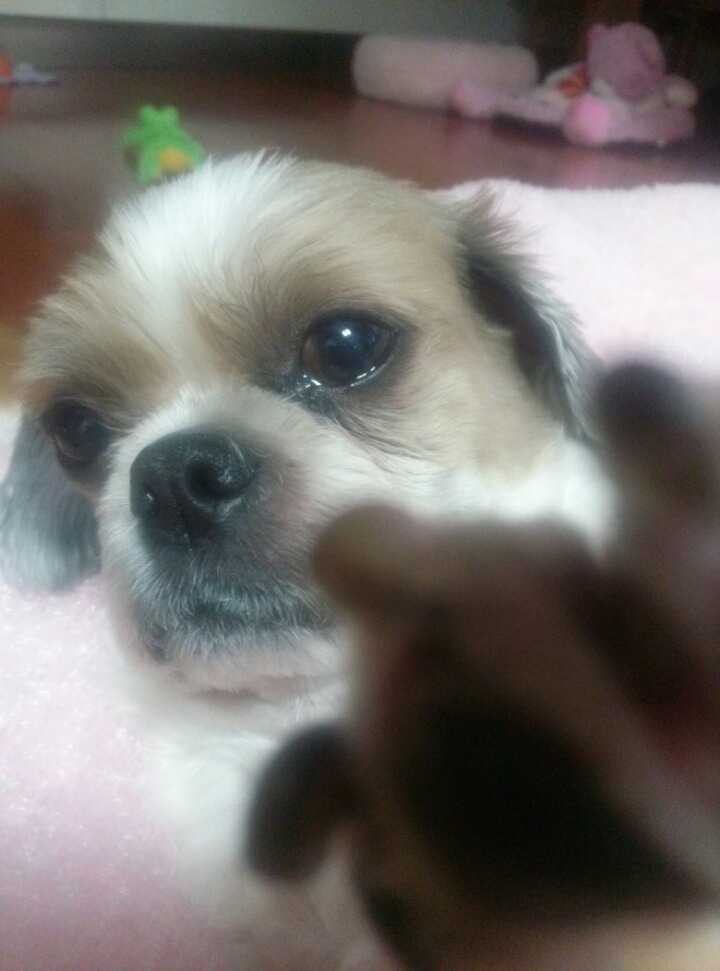 몽이는 사진찍지 말라고 카메라를 발로 막네요
