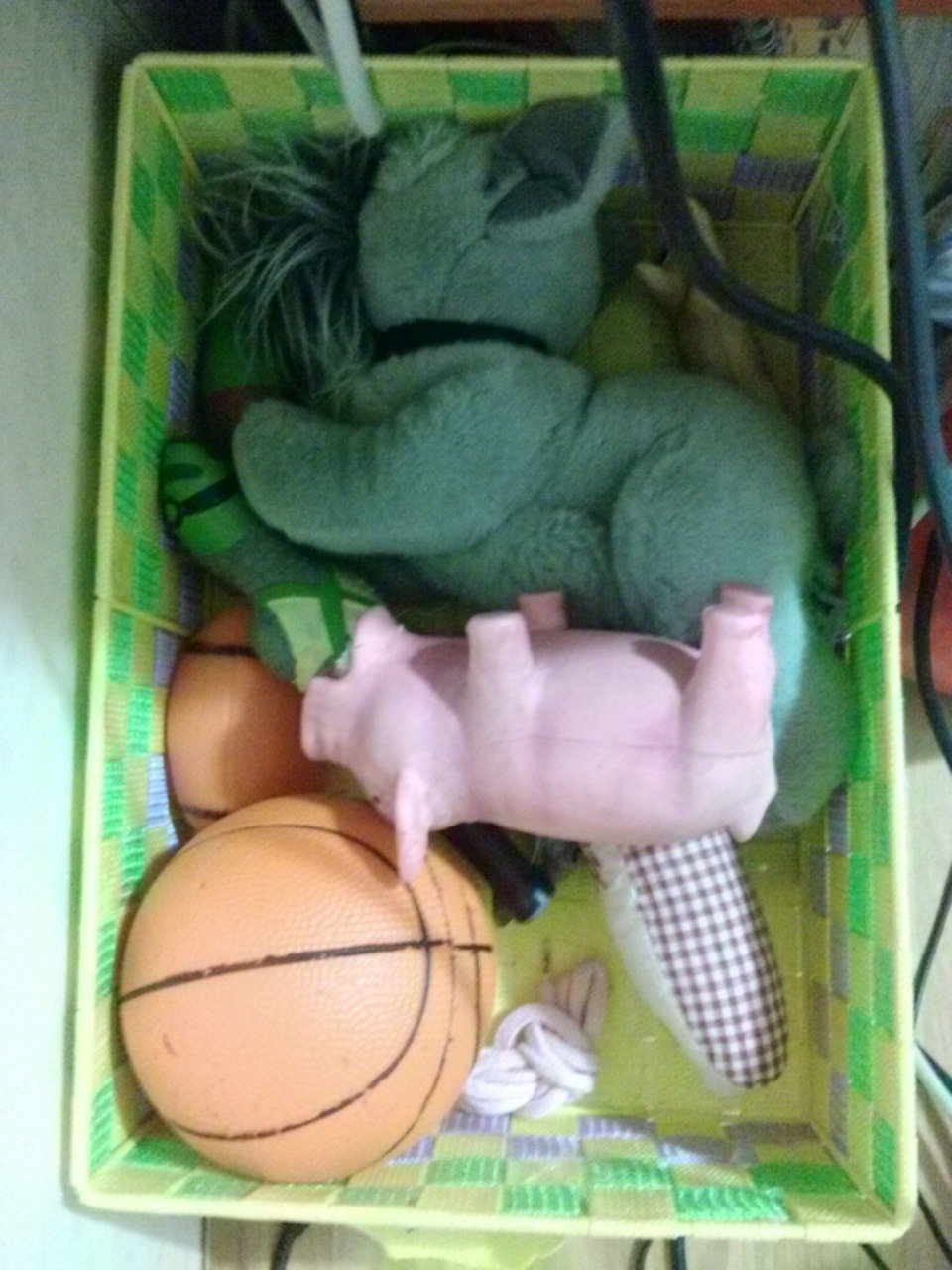 이건 알프레도가 아끼는 인형들과 삑삑이 장난감들이에요, 알프레도는 밥먹고나서 하나씩꺼내서 놀다가 집어넣고 다시 다른걸 꺼내서 놀곤해요. 자기물건 만지는걸 무지 싫어해요..