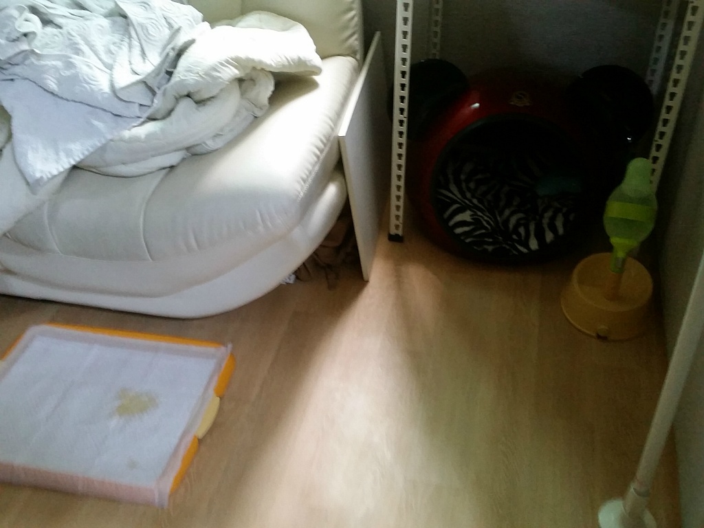 안녕하세요, 입양전제 임보 공고중인 초이가 오늘 집으로 왔어요. 집에오자마자 자기 배변판에 올라가 쉬아를 했어요^^