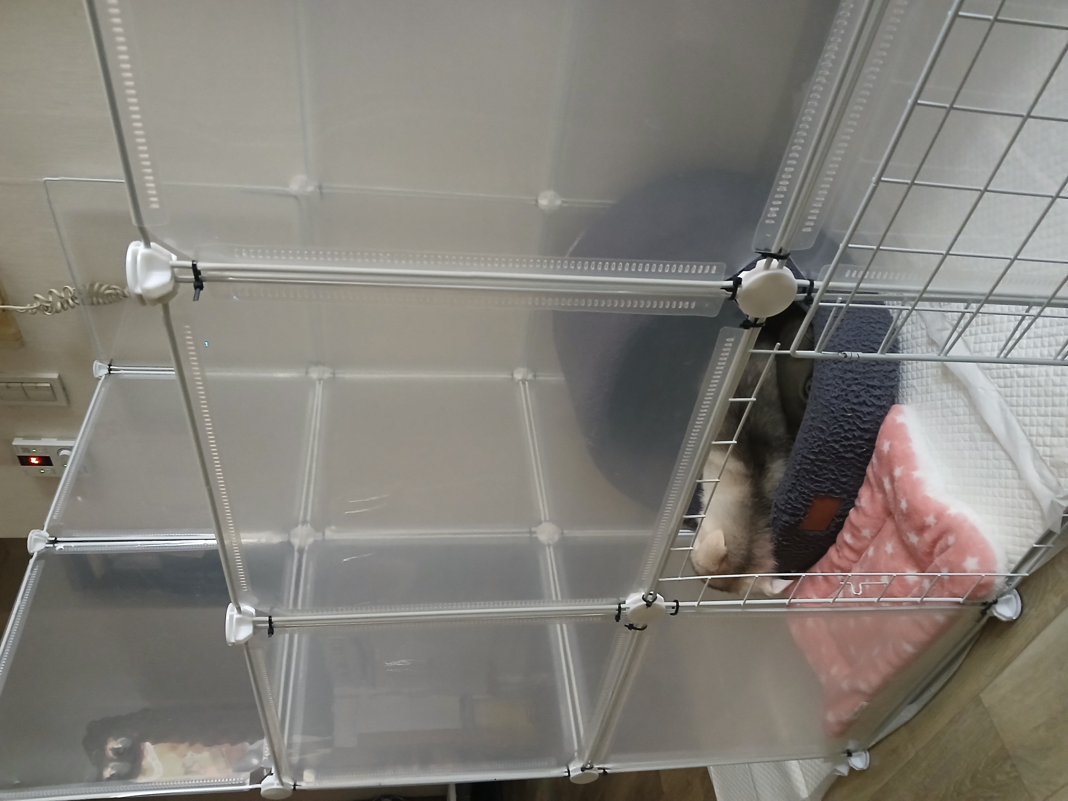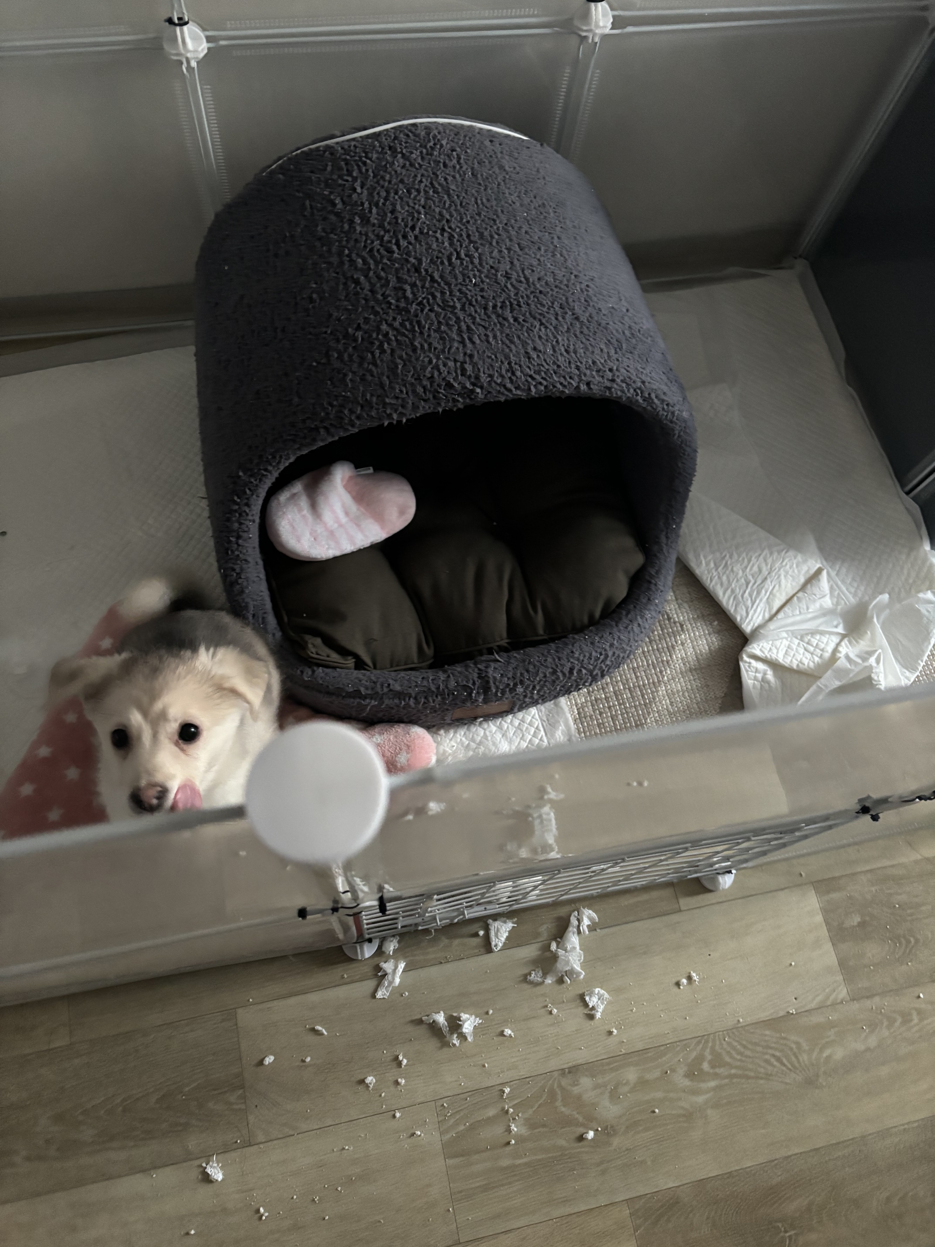 잠깐 외출했다오니 집도 끌어놓고 배변판도 찢어놓고 물도 엎어 버리고 심술 잔뜩 부려놓았어요. 하루종일 우다다다다 뛰고 물고 뜯고신나게 놀다가 혼자있는게 정말 싫은가봐요 한번은 문열고 탈출해서 케이지에서 자고있고 지붕위로 올라가서 넘어오려해서 위험해서 3단으로 증축공사하고 문도 꽁꽁 묶어서 못열지롱 ㅋㅋㅋㅋㅋㅋ