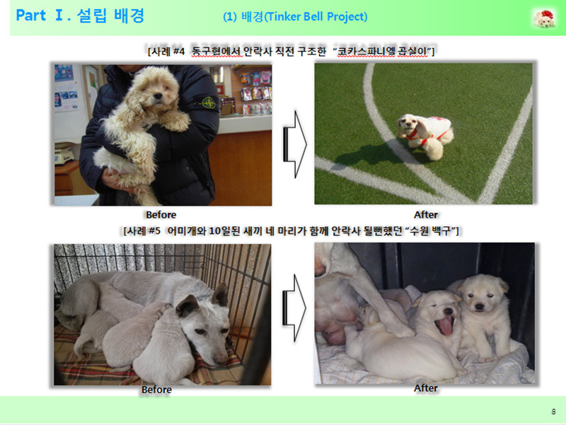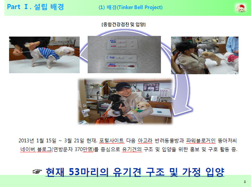 2013년 1월 7일 시작 이후, 지금까지 해온 팅커벨 프로젝트의 내용은 명확합니다. 보호소에 있던 안락사 직전의 유기견을 구조하여 검진, 치료 후 가정 입양 70%, 길거리에 버려지거나 방치된 유기견을 구조하여 검진, 치료 후 가정 입양 30% 정도의 비율로 일을 진행해왔습니다.