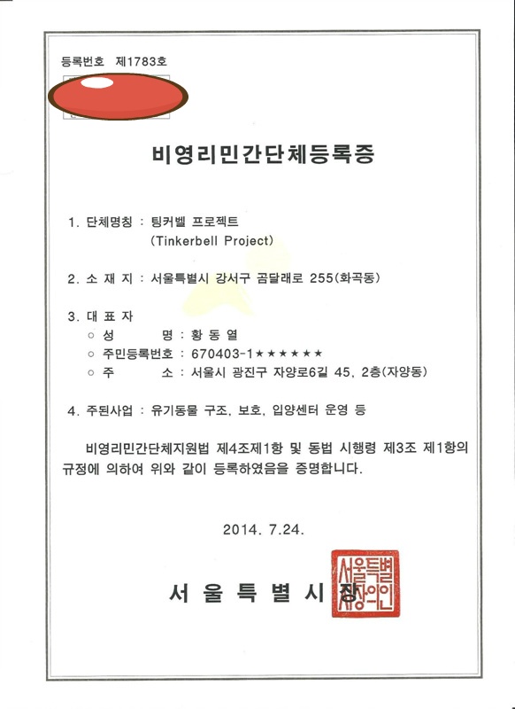 팅커벨 프로젝트는 2014년 7월 24일 서울시에 비영리민간단체로 공식 등록된 곳입니다.