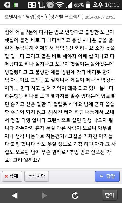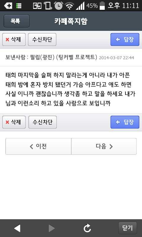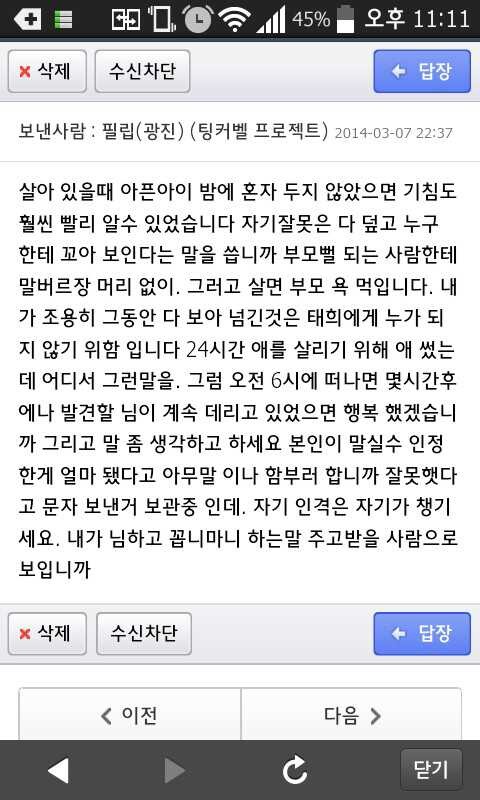 답댓글 작성자티슝티슝(부천) 작성시간 14.03.08 더이상 댓글을 늘리면 안된다고 생각했지만,, 필립님께서 먼저 나이어린사람이 "꼬우냐"는 말이 담긴 쪽지를 보냈다 내가 이소릴 들어야하냐 라고 하셨습니다 순식간에 그게 누굽니까 아니 그런 불순한 사람이 있습니까 쪽지를 공개하십시요 등등 엄청난 댓글이 달렸습니다 그 대상이 회원님들 모두 고맙다얘기하셨던 보리언니님이라는 것을 알고도 그럴까 싶을정도였습니다 띨이네님이 우정이든 오지랖이든 어쨋든 지인찬스로 보리언니님이 받은쪽지 보낸쪽지 다시 받은쪽지 공개한 것입니다 먼저 공론화시키고 같이생각해봐달라고하신건 필립님이십니다 생각해봐달라기에 생각하고 판단해달라기에 판단했습니다 이젠뭐진흙탕싸움이되었습니다만