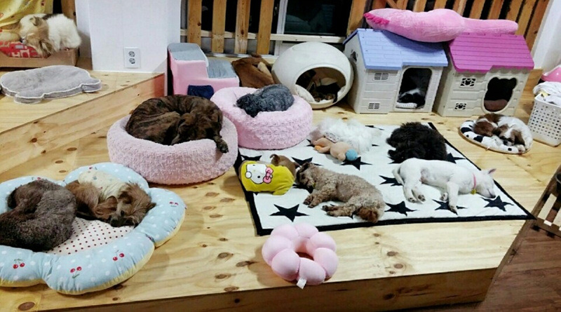 티구니 하우스 실내 공간에서 잠을 편안히 잠을 자고 있는 개님들.