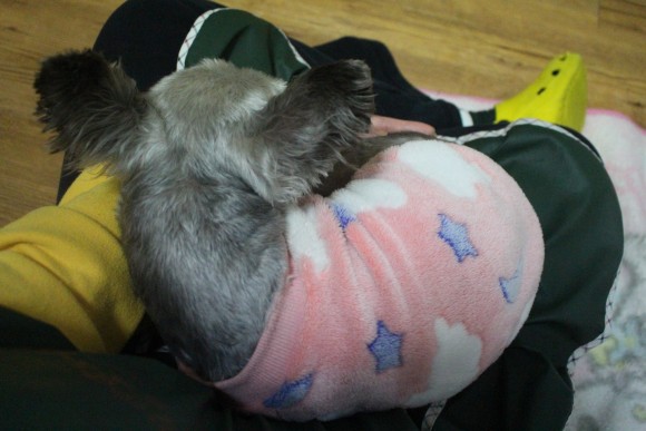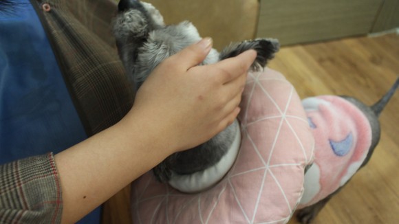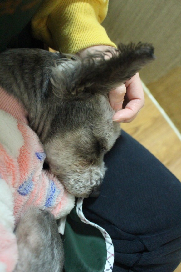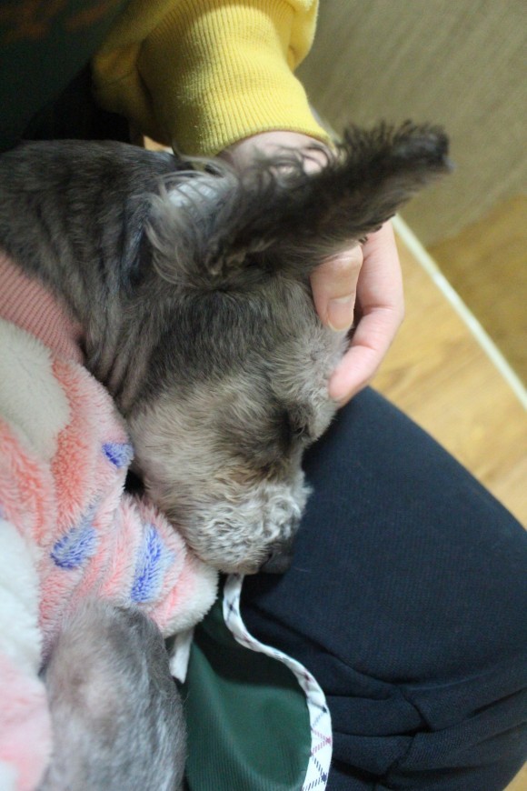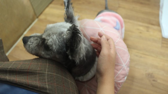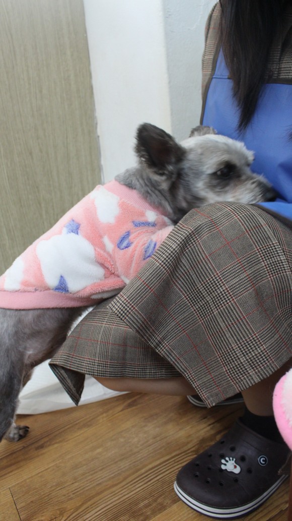 무릎 강아지 번개는 작지 않은 덩치임에도 아주 포근하게 잘 안겨있답니다. 몸을 동그랗게 말아 세상에서 가장 따뜻한 온기를 전해주는 아이에요.