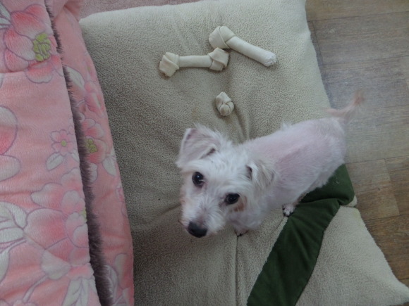 후식으로 개껌을 뜯으며 잘 준비를 합니다.