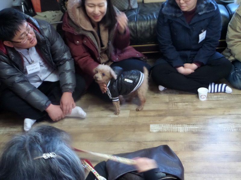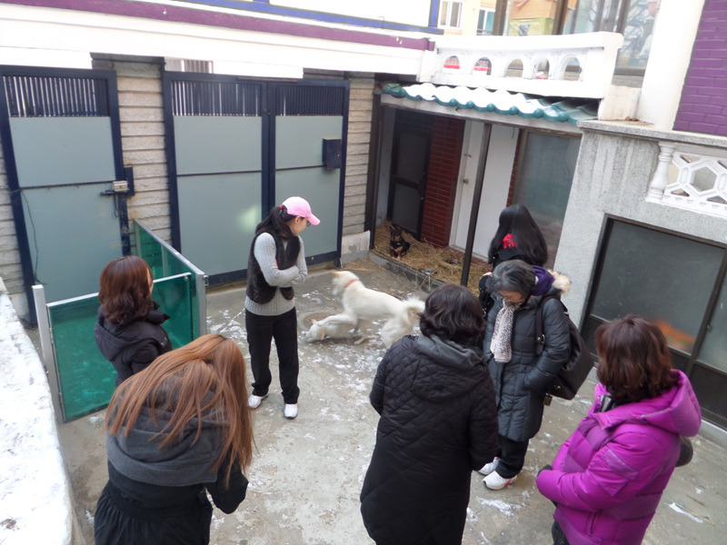 견주들이 있는 호텔견들을 견학하는 팅커벨 회원들