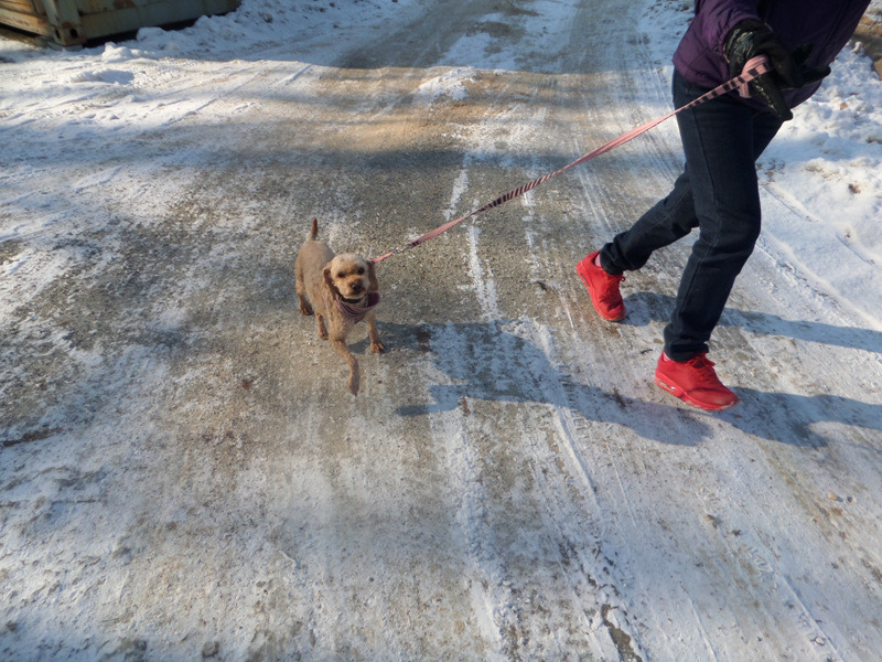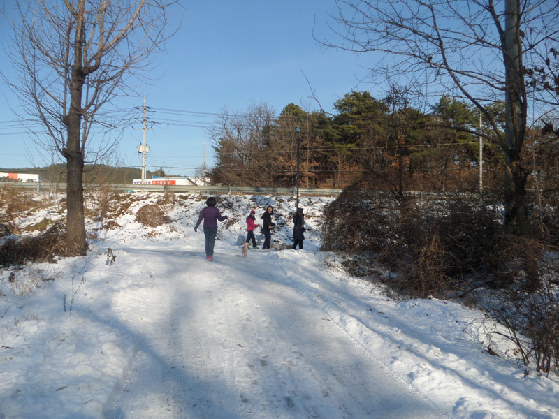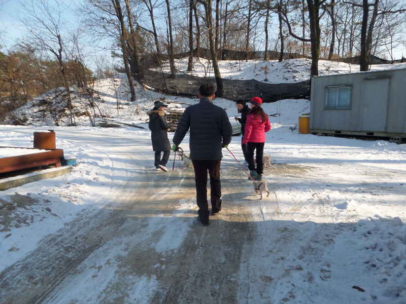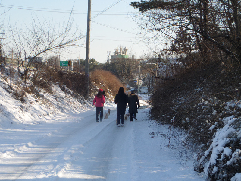 서울과 달리 아직 눈이 녹지 않은 길을 산책하는 강쥐와 팅커벨 회원들