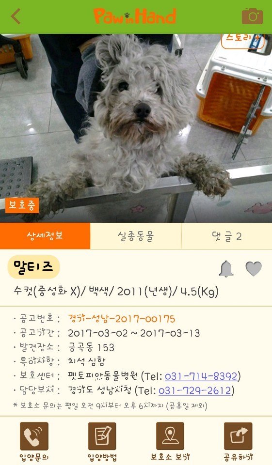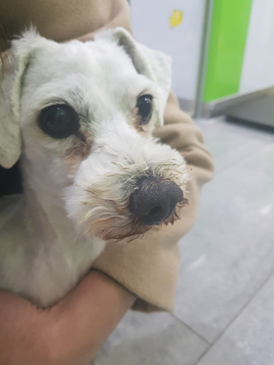 구조당시 추정나이가 6살이고 오래 거리 생활 한것으로 보이며 그로인해 사상충 감염과 호흡기 질환과 치석이 많이껴 있었음.