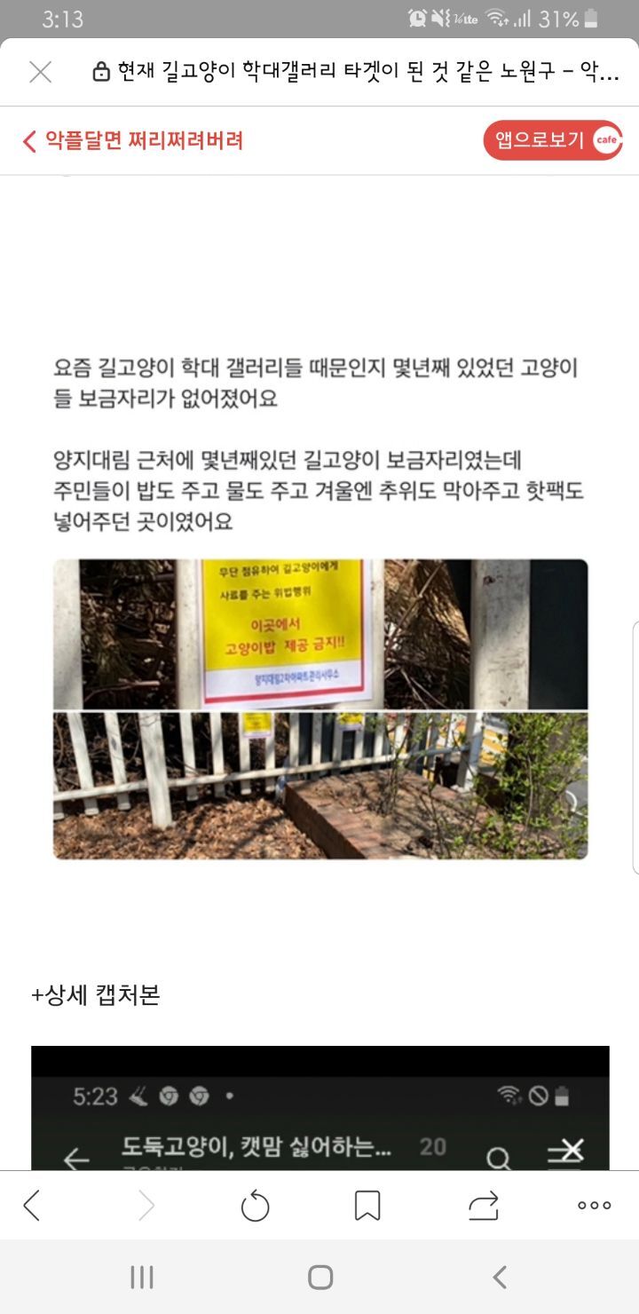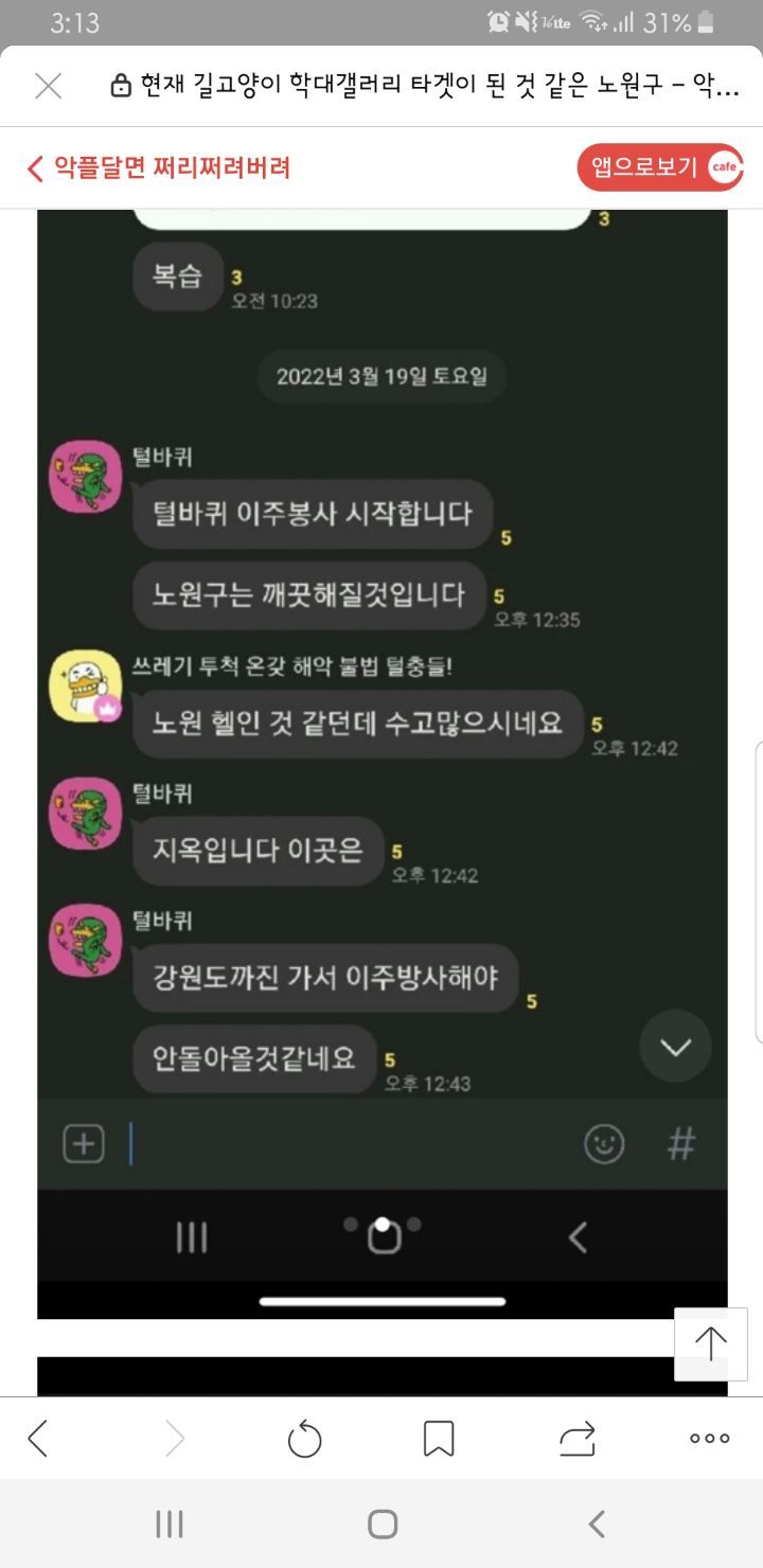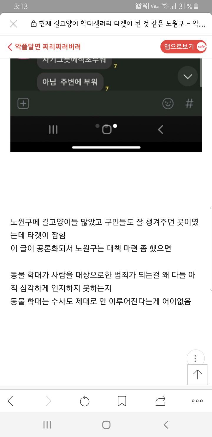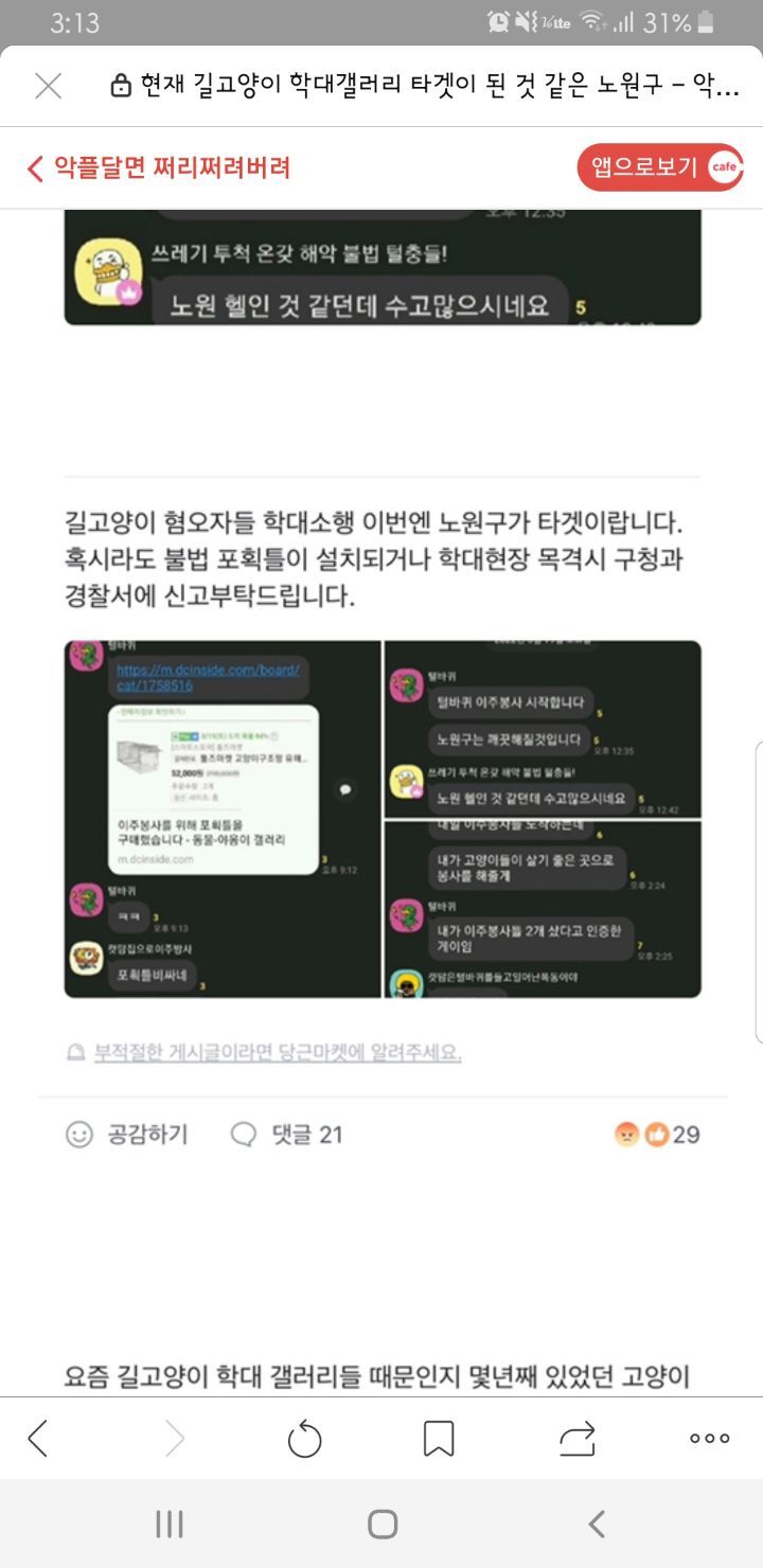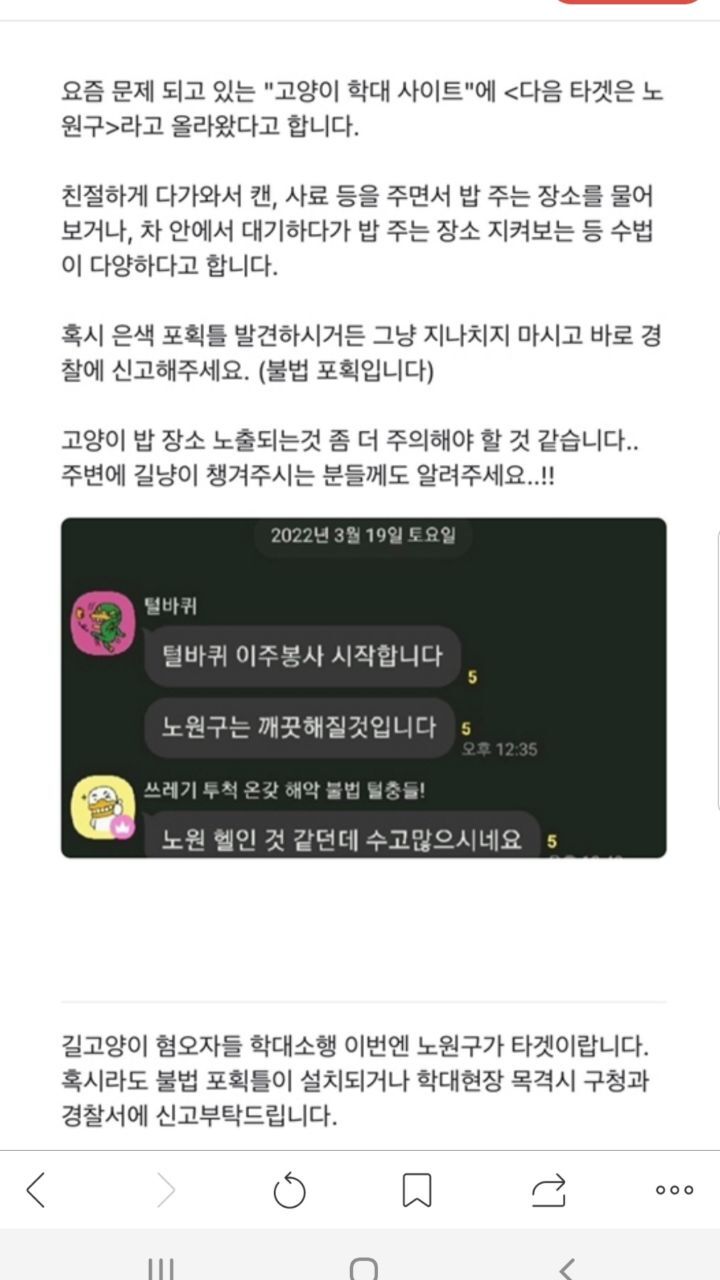 고양이학대사이트에 다음타겟 노원구 작성자디아나(서울노원)|작성시간22.04.02|조회수411 목록 댓글 4 글자크기 작게가 글자크기 크게가 노원구가 타겟이라고 하니각별한 주의가 필요합니다ㆍ많이 퍼날라 주세요ㆍ정신병자들이 왜이리 많을까요ㆍ 다음검색 현재 게시글 추가 기능 열기 북마크 공유하기 신고 센터로 신고 댓글 댓글 4 댓글쓰기 답글쓰기 댓글 리스트 작성자와라우(고와라) | 작성시간 22.04.02 세상이 깨끗할려면 고양이가 아니라 저런것들을 없애야죠 작성자타니언니(부천) | 작성시간 22.04.03 수사중으로 알고 있는데.. 도대체 언제 끝날까요..ㅜㅜ 희생당하는 아이들 생각하면 맘이 너무힘들어요.. 작성자포아리맘 | 작성시간 22.04.03 저건..악질 정신병이죠. 진짜 싹 다 밀어버리고 싶네요ㅜ아가들이 부디 안전하길..ㅠ 작성자똘이사랑 | 작성시간 22.04.03 제가 사는 노원구네요...ㅠㅠ큰 일 없어야 할텐데요 ... 댓글 전체보기