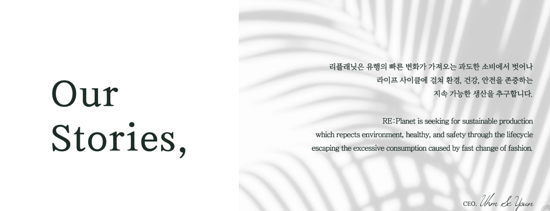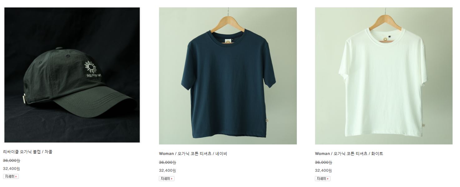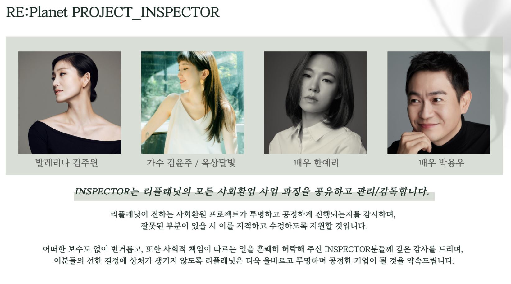 리플래닛이라는 사회적 기업이 있습니다. 발레리나 김주원님, 가수 김윤주님, 배우 한예리님, 배우 박용우님이 인스펙터로 있는 회사로 건강한 지구 살리기 등을 모토로 좋은 의류제품을 만들고 또 수익금을 사회에 환원하는 좋은 회사입니다.