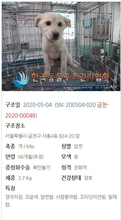 꽃지는 이달 초에 동구협에서 몽돌이, 파도와 함께 구해온 아이입니다. 보호소에서 공고기간이 지난 아이들의 구조가 늘 그렇지만 그중에서도 꽃지의 구조가 왜 더 극적이었냐하면 동구협에 입소했던 5월 4일에 6개월령에 3.7kg이었던 아이가 한 달만에 6.0kg로 2.3kg이 늘었어요.그러면 앞으로 무척 클 것이 예상이 된 것입니다. 게다가 코로나 바이러스 양성 반응이었습니다.