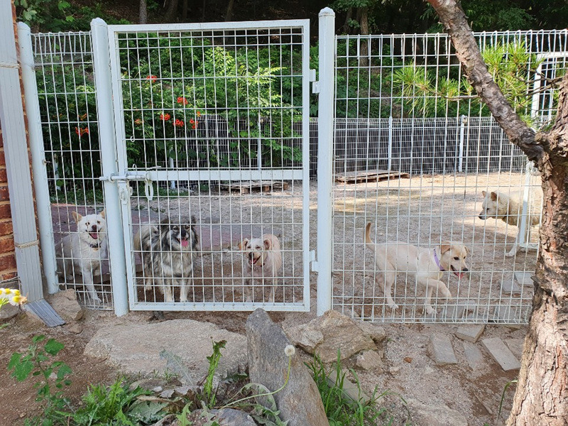 펜스 뒤에 누워 있는 덩치큰 애는 흰돌이입니다 ~