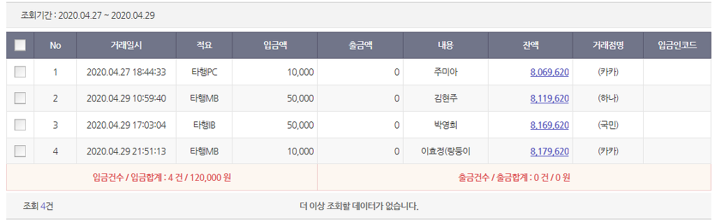 황금부자연숙 30,000원 심도희 50,000원 성혜민 22,500원 박진영 30,000원 강민주 22,500원 유진 12,500원 이정순 12,500원 노수미 12,500원 이영지 50,000원 김준희 50,000원 구내염치료 10,000원 김정남 52,500원 권철범 50,000원