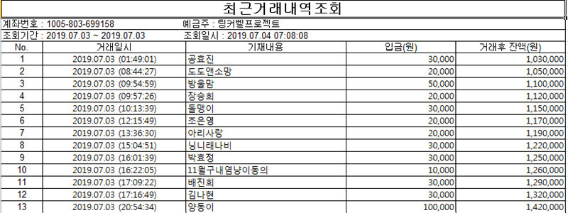 뚱아저씨 100,000원 김은희버디가을 30,000원 심혜원 10,000원 허우정 10,000원 이나래 10,000원 김미성 50,000원 밸리앤나비 10,000원 만두연두맘 20,000원 양수경 20,000원 주딴단 10,000원 정미희바니짱 20,000원 쩜이난이맘 30,000원 수달님 10,000원 유진 10,000원 김은경 50,000원 김혜린 30,000원 또자 10,000원 양정심쭈쭈맘 50,000원 봉구 30,000원 김도이 30,000원 아라맘 50,000원 정인원 50,000원 오나겸 10,000원 정윤상 30,000원 이내 30,000원 김정이hoho맘 20,000원 희망이네 30,000원 와라우 50,000원 이은경 50,000원 권혜진 30,000원 이연수 10,000원 바비아빠 30,000원 이지니망치누나 30,000원 로또토토대박보미뽈롱 10,000원 버디누나 30,000원