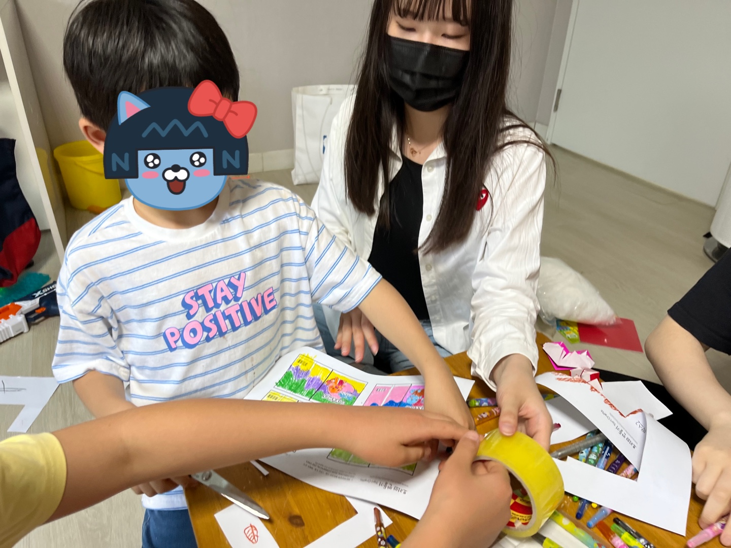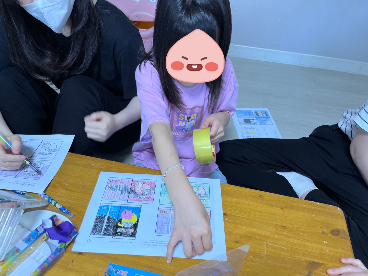 색칠한 도안을 테이프를 이용하여 코팅해주었어요ㅎㅎ