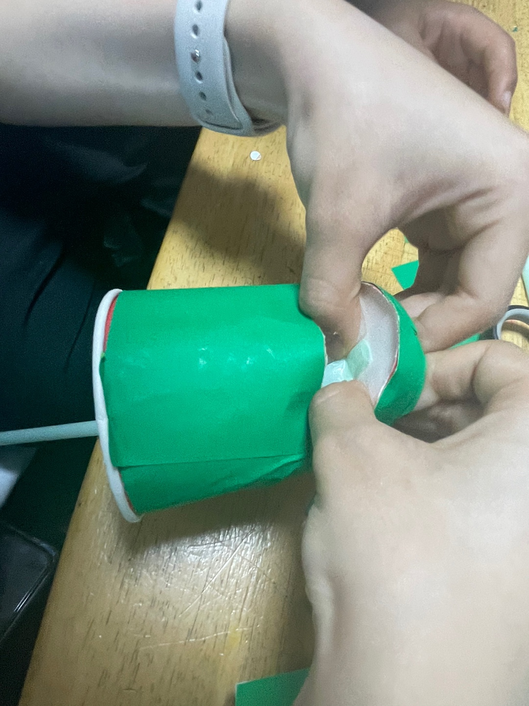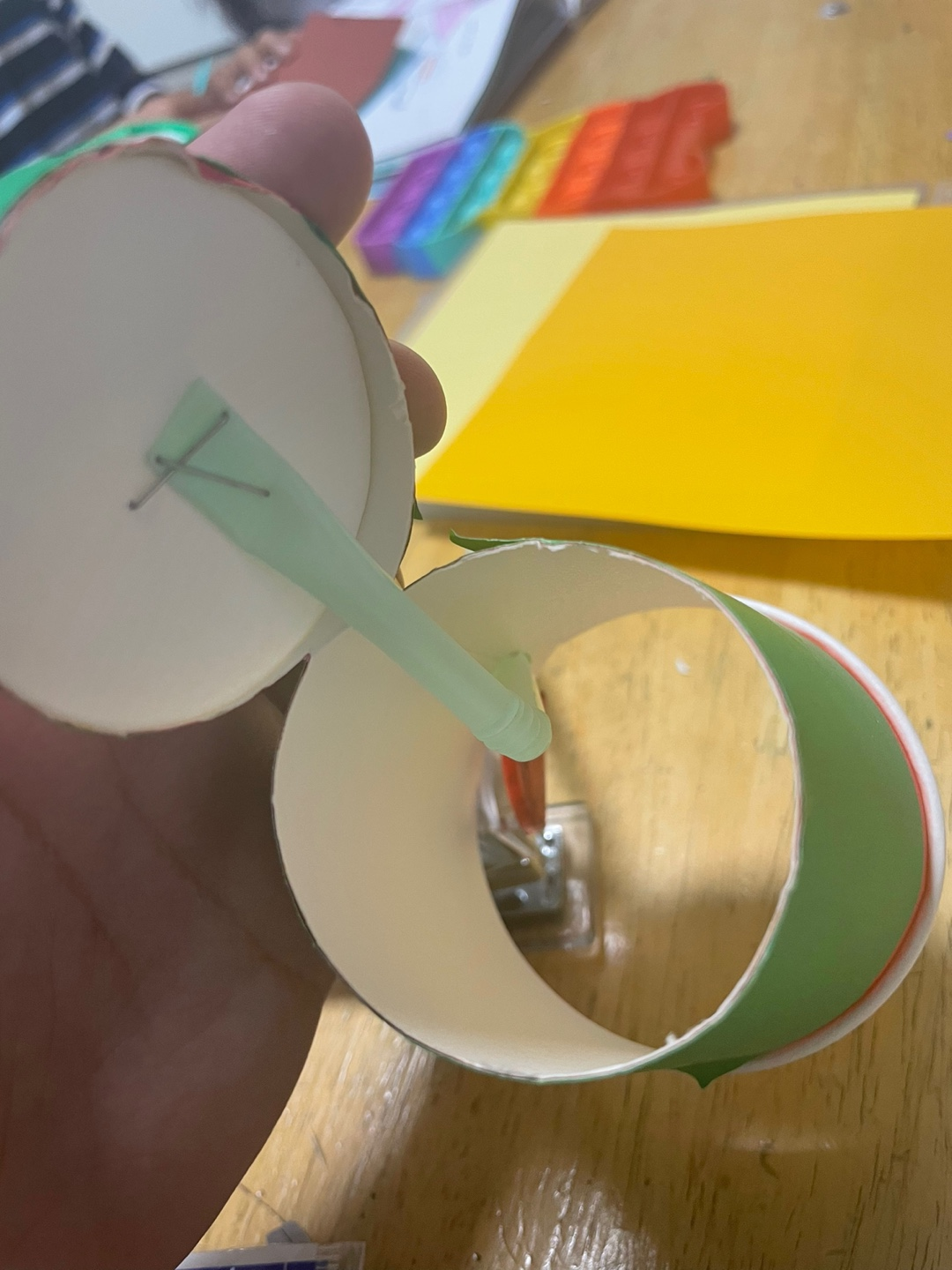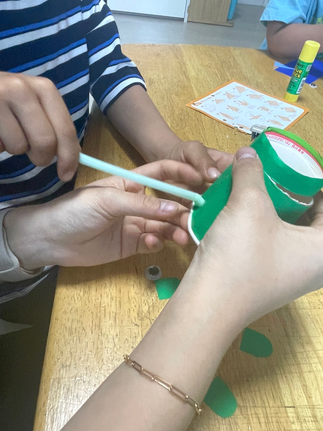 다음으로 종이컵에 구멍을 뚫고 빨대를 컵 안으로 넣어주고 있네요!