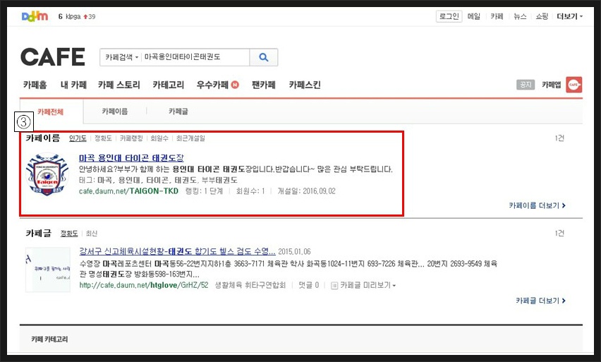 3. '용인대타이곤태권도장'클릭.