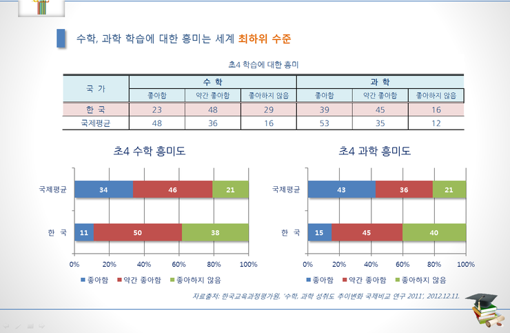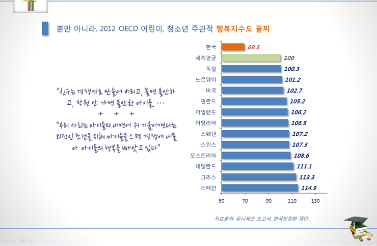 우리나라 학생들의 학업 성취도는 세계 최상위 수준을 보이고 있지만, 수학과 과학 학습에 대한 흥미도는 세계 최하위 수준을 보이고 있다. 뿐만 아니라, OECD 국가 대비 우리나라 어린이와 청소년들의 행복지수도는 꼴찌이다.