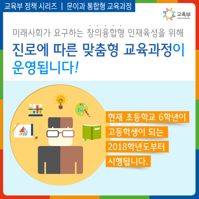교육부는 2014년 9월 24일 미래사회가 요구하는 창의융합형 인재육성을 위해 '2015 문이과 통합형 교육과정'의 총론 주요사항을 발표하였다. 새 교육과정은 학생들이 인문, 사회, 과학기술에 대한 기초 소양을 함양하여, 인문학적 상상력과 과학기술 창조력을 갖춘 창의융합형 인재로 성장할 수 있도록 우리 교육을 근본적으로 개혁하자는 취지로 추진되었다. 새 교육과정은 2009년 개정된 현행 교육과정의 교육현장 적용과정에서 제기된 문제점을 개선하고자 추진되었다.