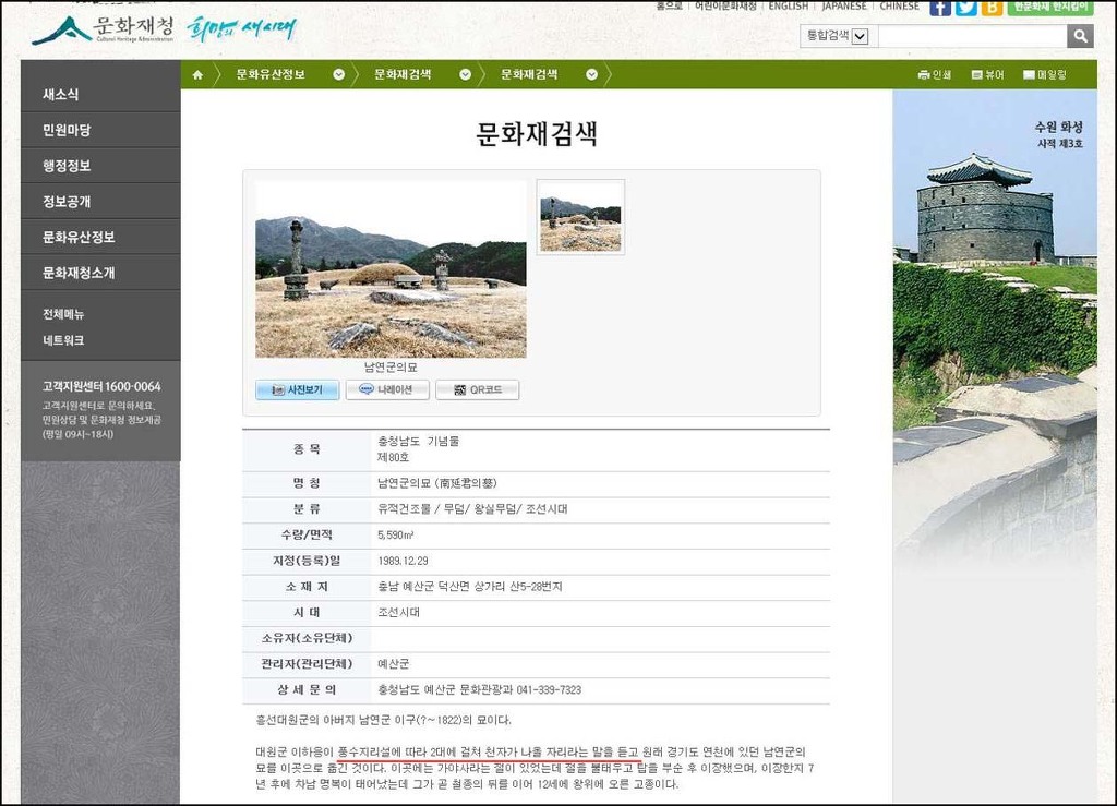 아래는 묘소를 조성하기 전 2대의 천자가 출한다고 예언을 하였다고 하는 내용의 문화재청