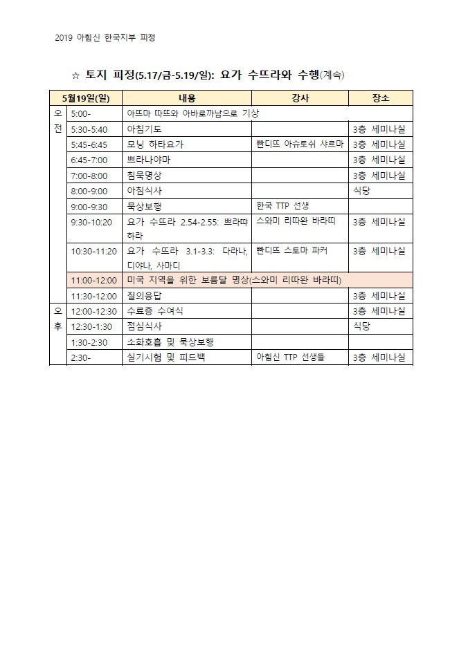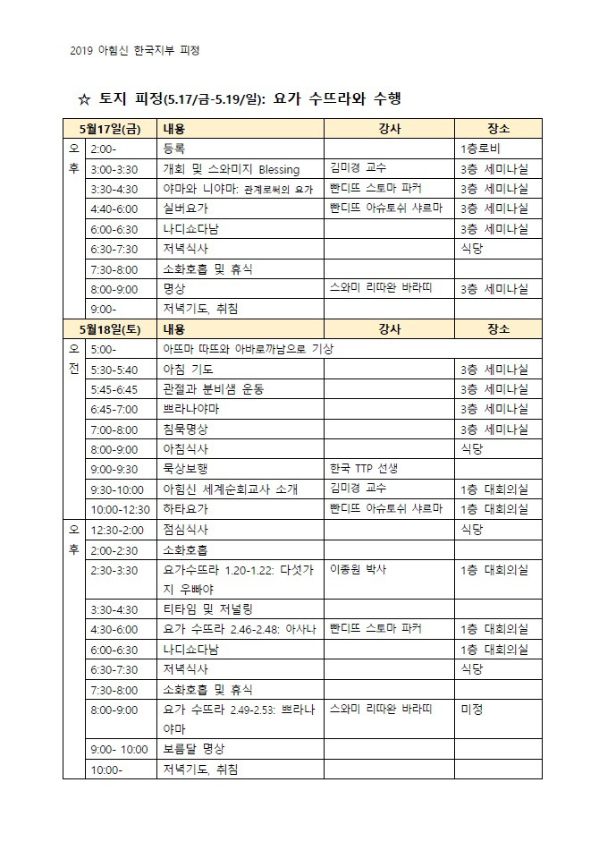 2019년 5월 토지문화관 피정 상세 일정 작성자설미라|작성시간19.05.11|조회수411 목록 댓글 0 글자크기 작게가 글자크기 크게가 토지문화관 피정에 오실 때에는,1. 수건을 포함한 세면도구와 개인매트를 꼭 가져오세요.2. 금요일 오후 3시에 개회식이 있고, 개회식에 이어 스와미지의 블레싱(Blessing)이 있을 예정이니 시간 엄수 참석바랍니다. 2019 아힘신 토지, 거제 - 서울 수련회 일정.pdf 첨부파일첨부된 파일이 3개 있습니다. jpg 파일 토지문화관 피정1.jpg 다운로드 jpg 파일 토지문화관 피정2.jpg 다운로드 pdf 파일 2019 아힘신 토지, 거제 - 서울 수련회 일정.pdf 다운로드 다음검색 현재 게시글 추가 기능 열기 북마크 신고 센터로 신고 댓글 댓글 0 댓글쓰기 답글쓰기 댓글 리스트
