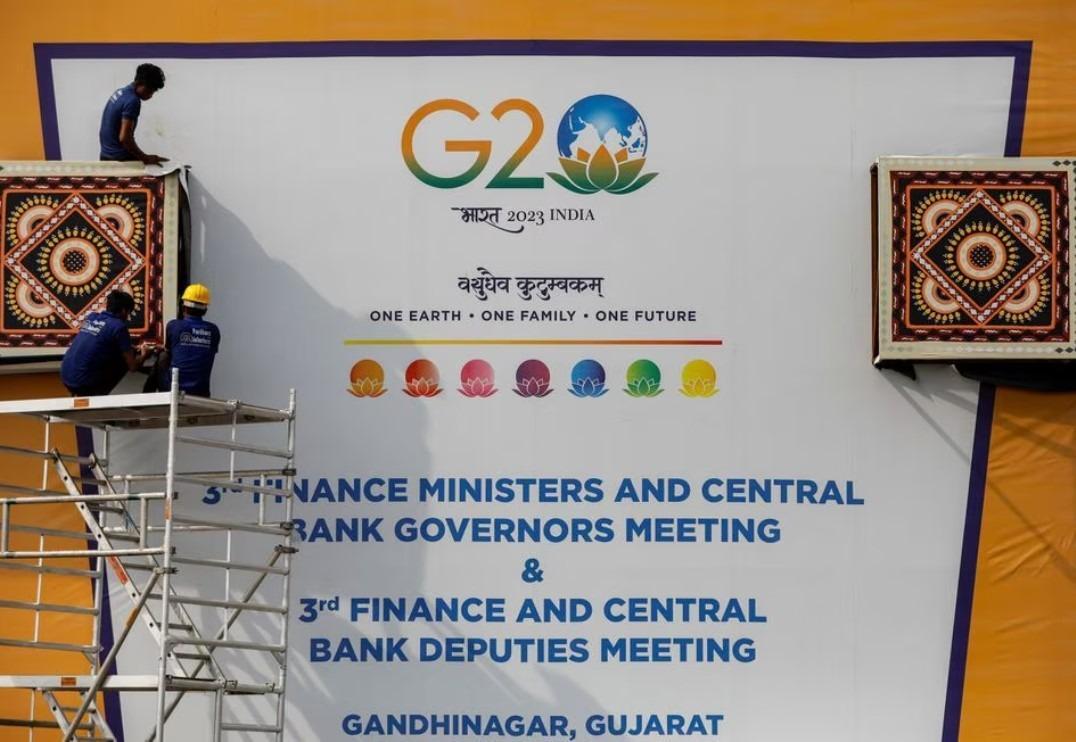 사람들이 2023년 7월 13일 인도 구자라트의 간디나가르에서 열린 G20 재무장관과 중앙은행 총재 회의 장소 근처에 비축판을 설치하기 위해 노력하고 있습니다. (PHOTO / REUTERS)