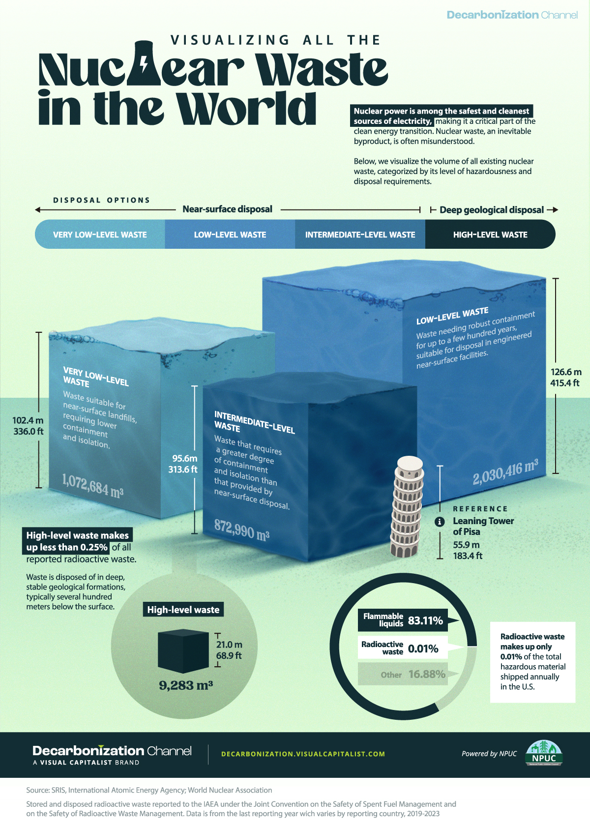 국가 공공 유틸리티 협의회(National Public Utilities Council) 와 협력하여 이 그래픽은 국제 원자력 기구(IAEA ) 의 데이터를 기반으로 위험 수준 및 처리 요구 사항에 따라 분류된 모든 기존 핵 폐기물의 양을 보여줍니다 .