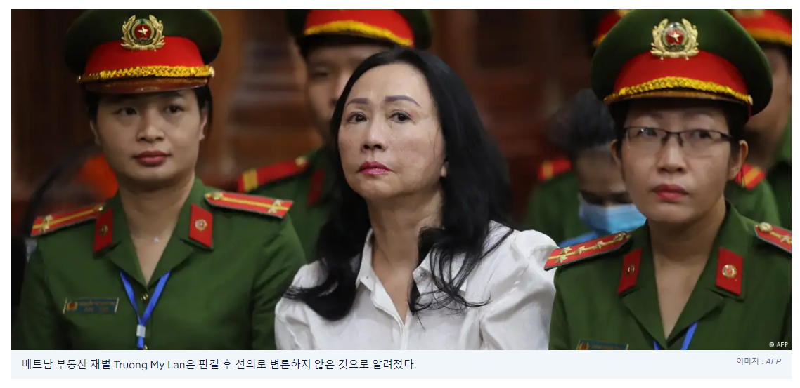 베트남 부동산 재벌 쯔엉미란(Truong My Lan)이 베트남 사상 최대 규모인 304조 동(124억6000만 달러) 규모의 금융 사기 사건에 연루된 혐의로 목요일 사형을 선고받았다 .