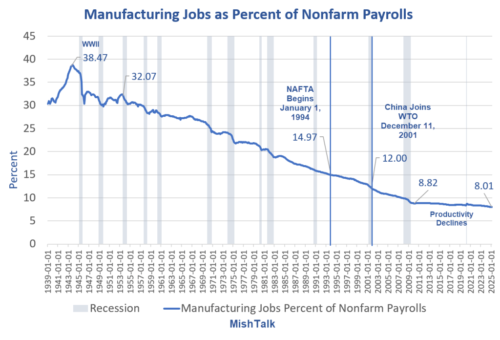 대중적인 통념과는 달리 NAFTA나 중국의 WTO 가입은 1953년 이래 제조업 고용의 장기적 추세에 영향을 미치지 않았습니다.
