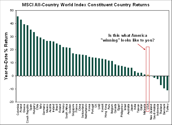 S&P 500은요? 겨우 1.2% 상승하며 간신히 플러스(+) 수준에 머물렀습니다. MSCI All-Country World Index에 편입된 47개국 중 미국의 연초 대비 수익률은 41위입니다.