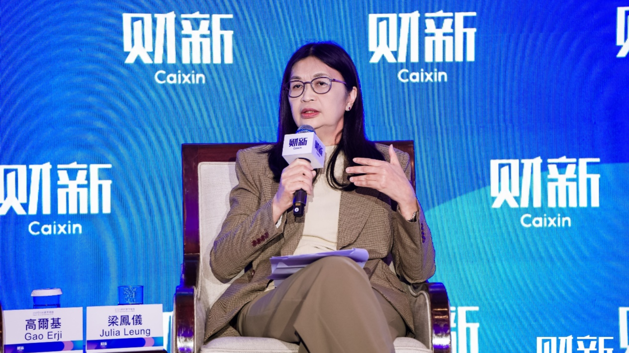 홍콩 증권선물위원회 위원장 줄리아 렁펑이(Julia Leung Fung-yee)가 2025년 6월 13일 카이신 서머 서밋 2025에서 연설하고 있다. (차이나데일리 제공)