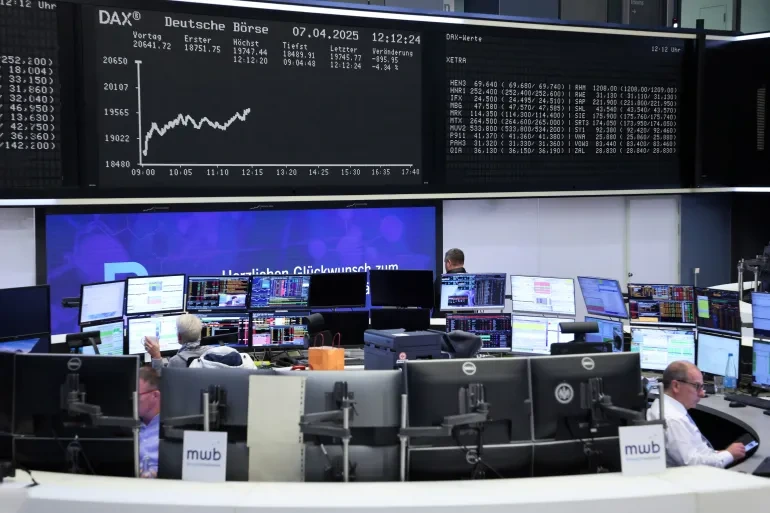 2025년 4월 7일, 독일 서부 프랑크푸르트 암 마인 증권거래소에서 독일 주가지수 DAX의 가치를 표시하는 게시판 앞에서 거래자들이 작업하고 있다[다니엘 롤랜드/AFP]