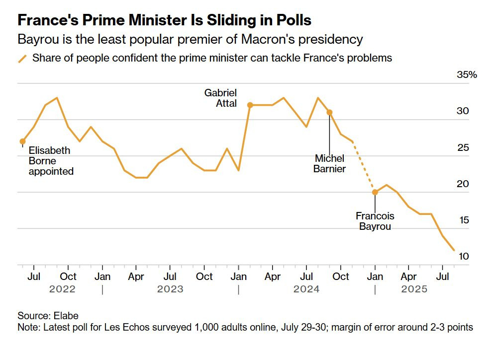프랑수아 바이루의 소수 정부가 다음 달 신임 투표에서 축출될 가능성이 커지면서 화요일에 프랑스에 새로운 정치적 위기가 올 것이라는 우려가 퍼졌습니다.