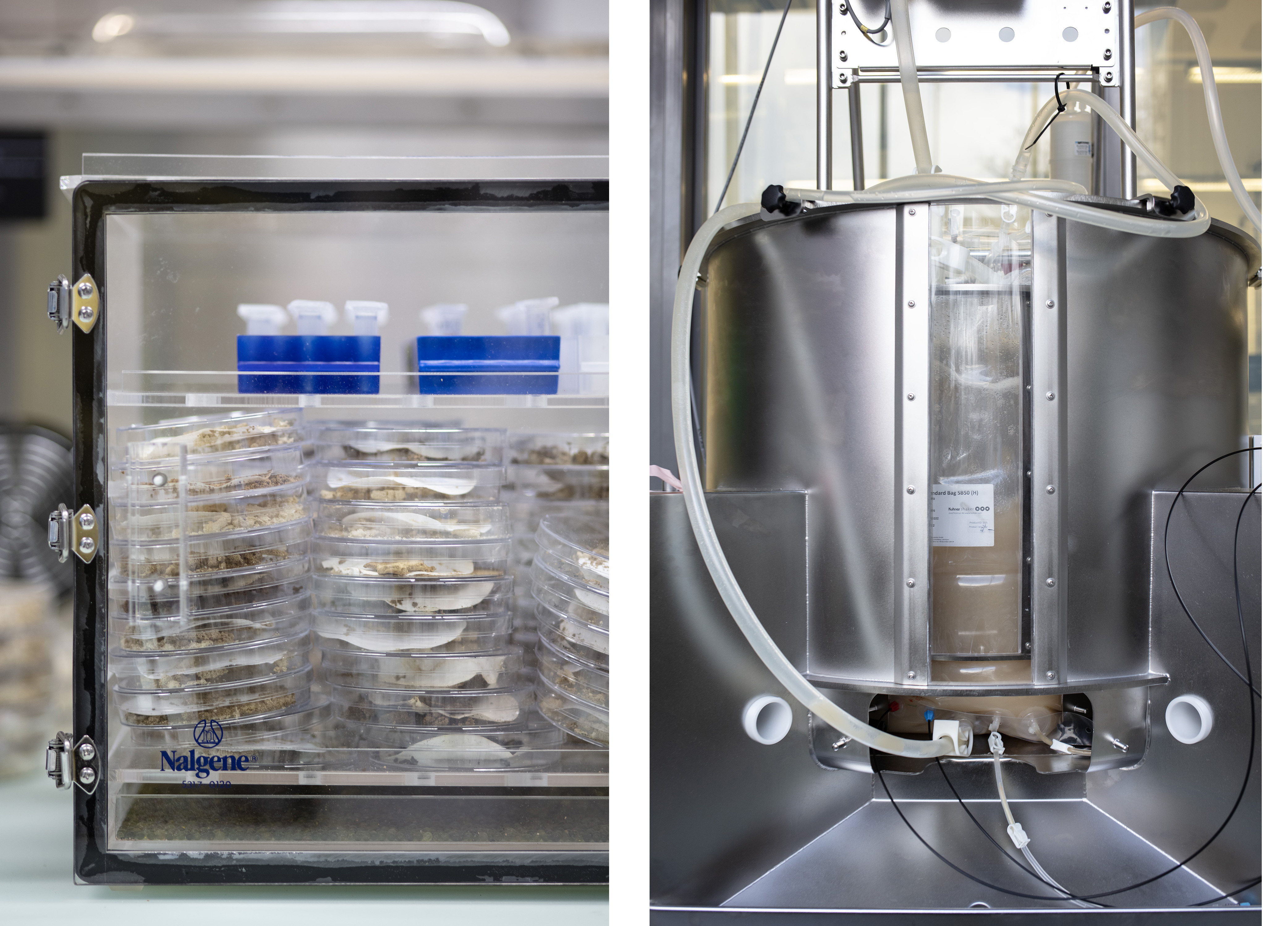 세포 배양으로 얻은 조직이 특정 크기에 도달하면 생물반응기로 옮겨집니다. (토마스 케른 / Swissinfo.ch)