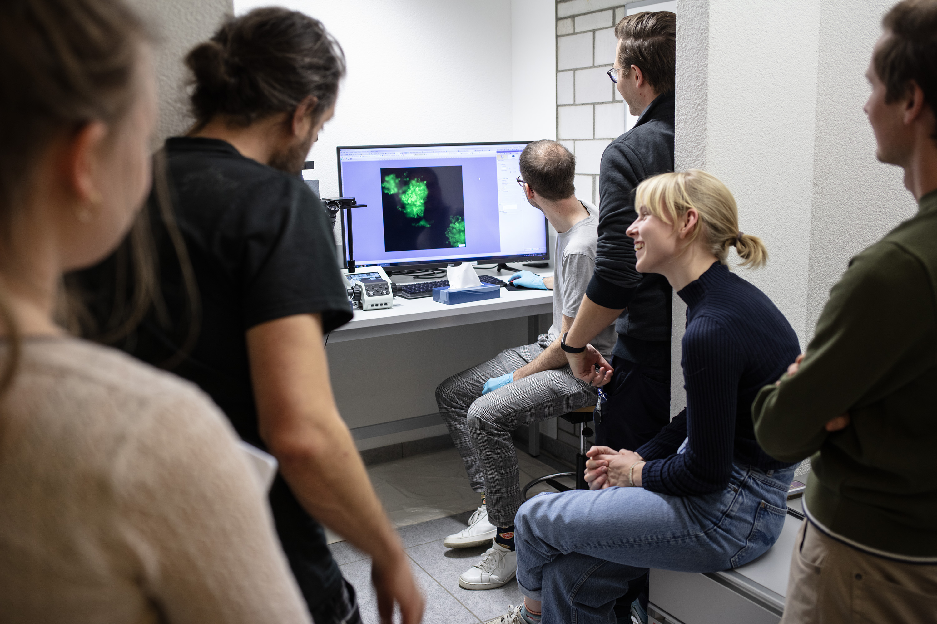 전자 현미경으로 세포 배양액이 성장 가능성을 보일 때 모두가 미소를 짓습니다. 토마스 케른 / Swissinfo.ch