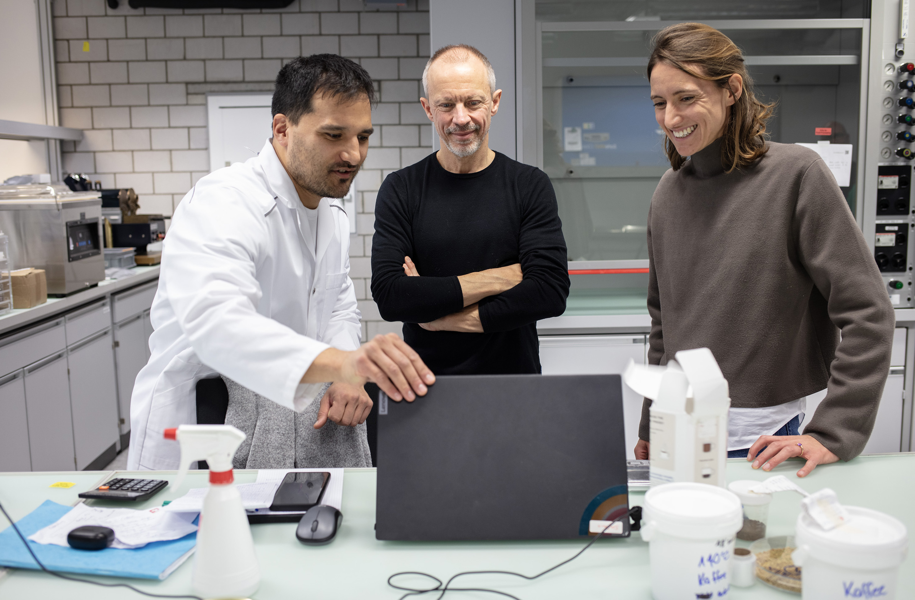 실험실에서 실험 데이터에 대해 토론하고 있습니다. 토마스 케른 / Swissinfo.ch