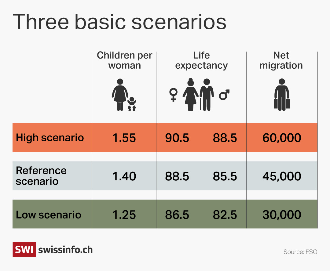 Budliger의 예측은 두 가지 가정에 기반합니다. 첫째, 그는 연방 정부의 인구 증가 예측, 즉 소위 기준 시나리오가 지나치게 낙관적이라고 생각합니다. 더 가능성이 높은 시나리오는 FSO의 보다 보수적인 예측으로, 스위스 인구가 2043년부터 감소하기 시작할 것으로 예상합니다.