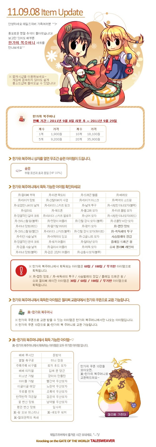 [스크랩] 9월 8일 한가위 복주머니 업데이트 안내 작성자OUTSIDER&moon|작성시간11.09.08|조회수10 목록 댓글 0 글자크기 작게가 글자크기 크게가 당분간 앤화분 바이- 역시 이게 진짜 이벤트 -_ 다음검색 스크랩 원문 : 테일즈위버(TalesWeaver) 현재 게시글 추가 기능 열기 북마크 공유하기 신고 센터로 신고 댓글 댓글 0 댓글쓰기 답글쓰기 댓글 리스트