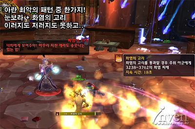 - 아란의 마나가 20%로 떨어지면 즉시시전 광역 양변 후 물을 창조해서 마십니다. 약 6초 정도 후 마나는 모두 회복되고, 즉시시전 불덩어리 작열을 모든 공대원에게 날리는데 이것이 대미지가 7000정도 입니다. (저항 가능)