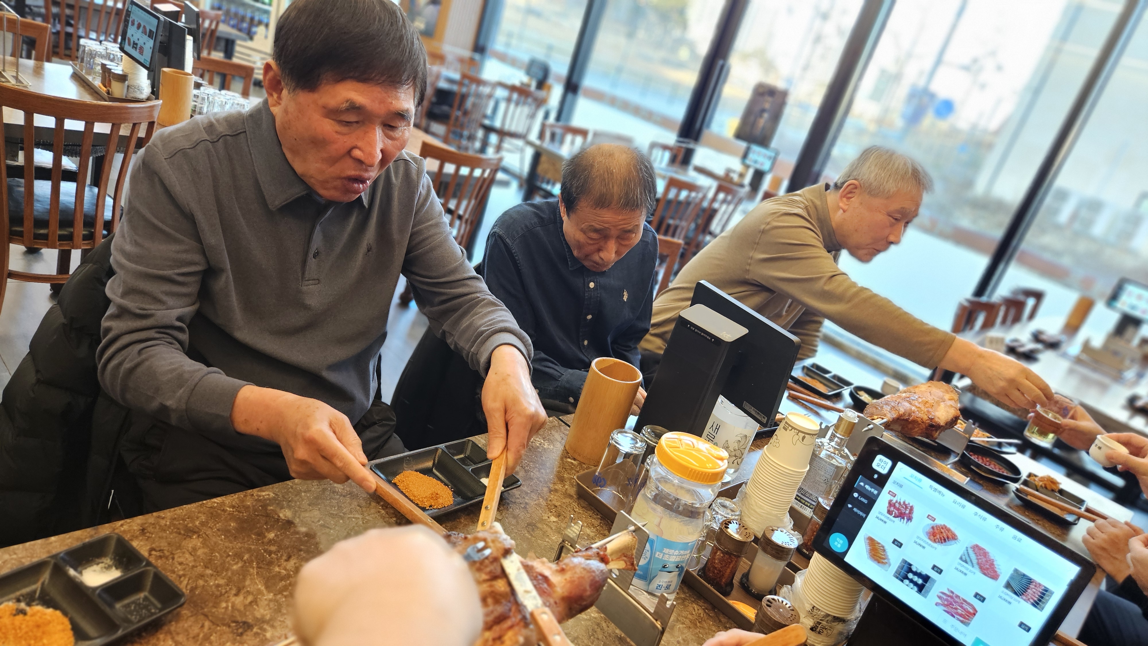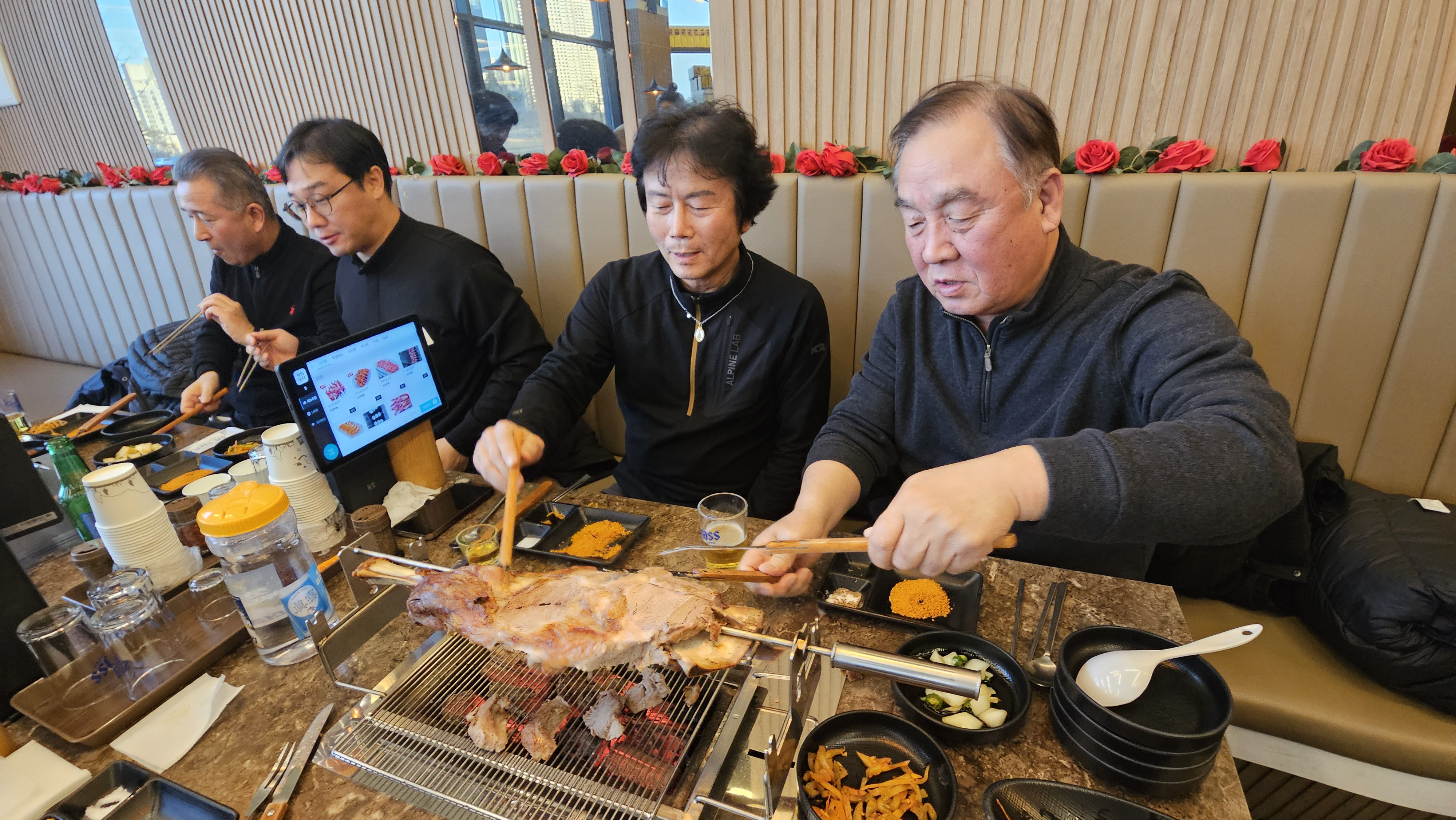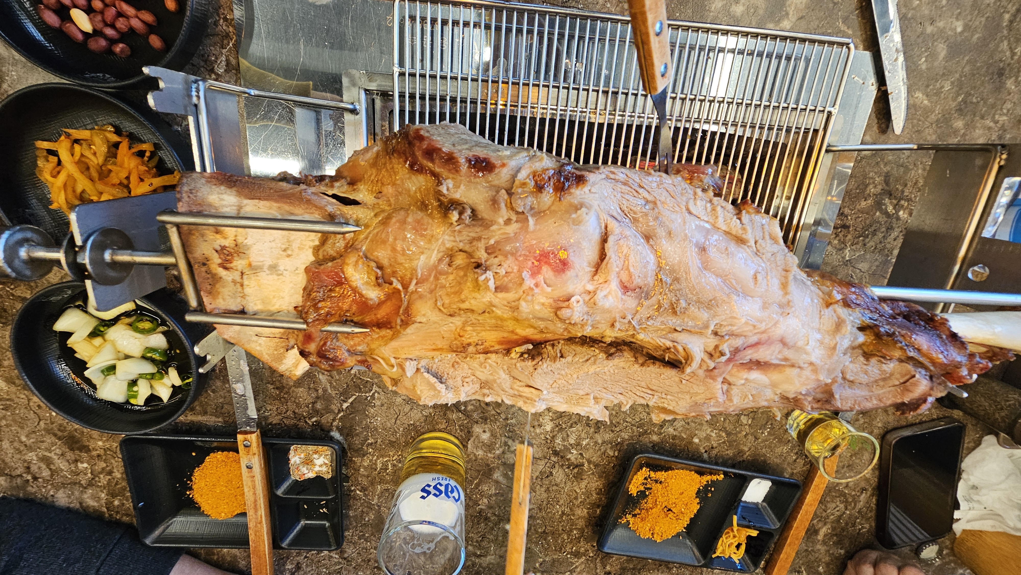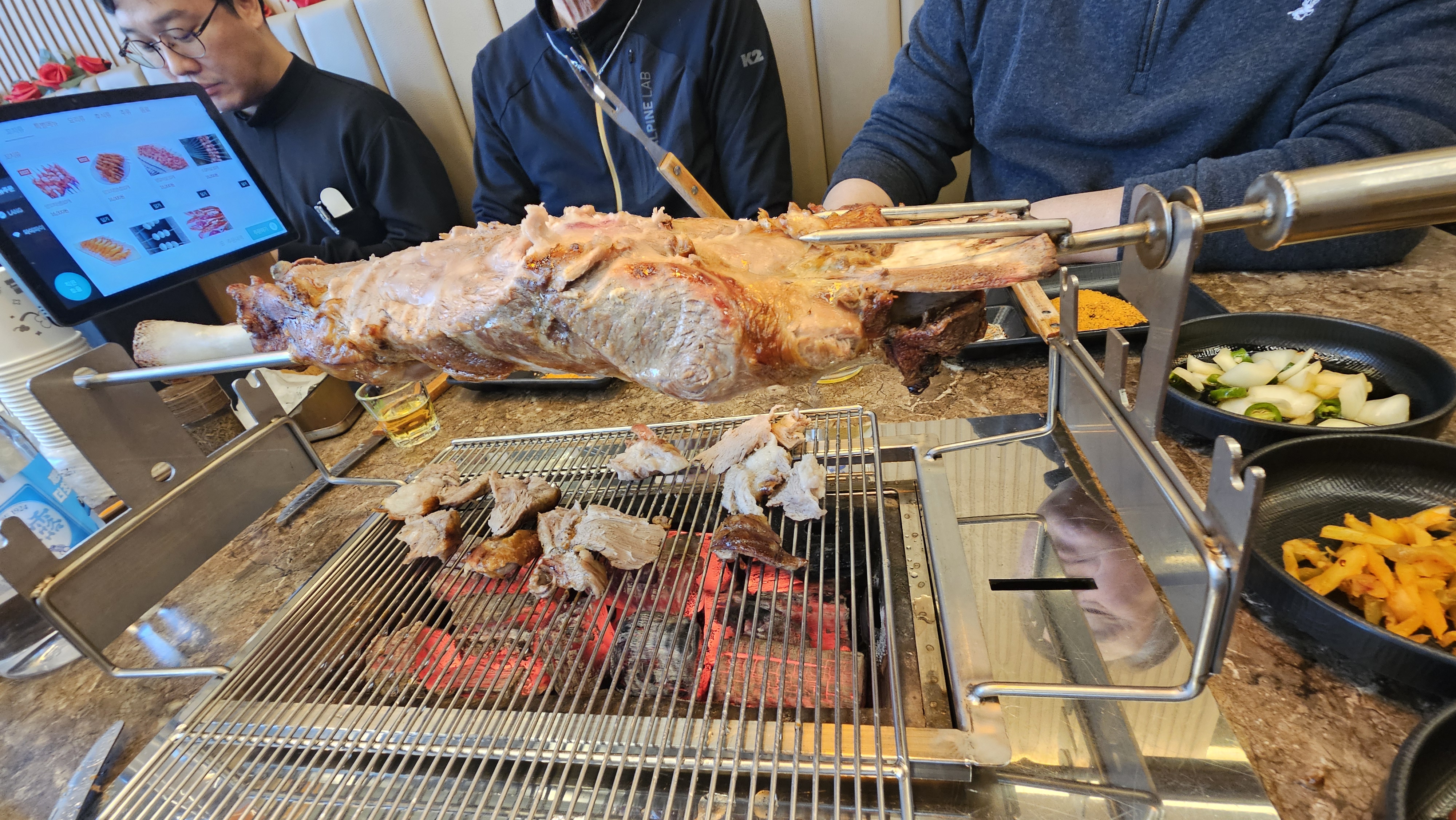 양다리 구이 2kg 2개를 두 테이블에서 얋게 썰어서 먹습니다.